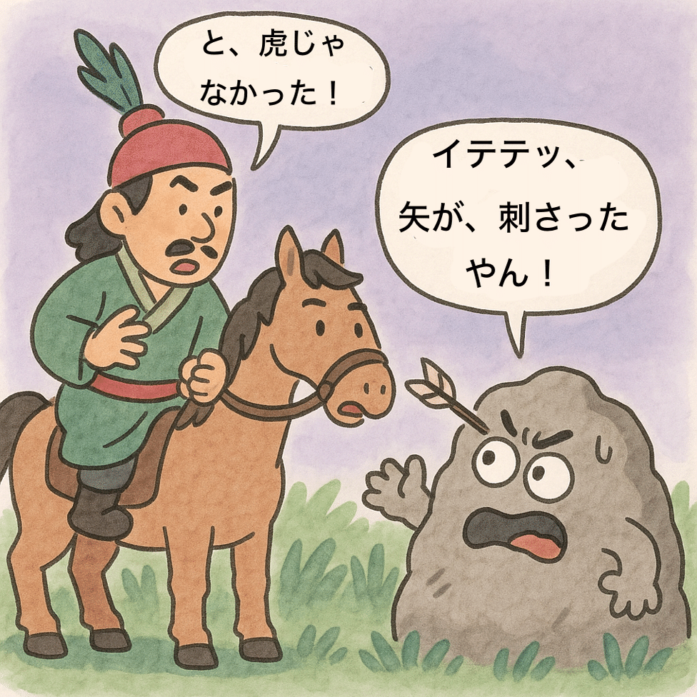 それを虎だと思い込み、弓を引き絞って射たところ、矢は深く突き刺さり、羽根まで飲み込まれるように沈んだ。