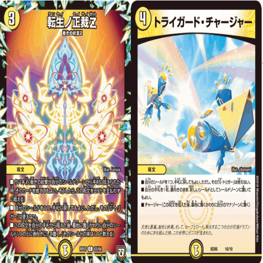 また他にも、「天地ヲ別ツ龍断ノ裁キ」(上図左)、「煌世主サッヴァーク†」(上図右)のような、相手が攻撃する時に、自分の表向きのカードを3枚裏返して手札から発動する受け札もあります。裁きの紋章を唱えることで表向きのシールドの数を増やせるので、こちらも簡単に相手へカウンターを仕掛けることができるカードです。
