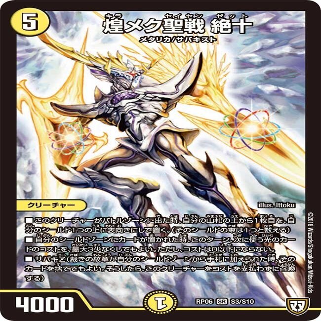 上にある「煌メク聖戦 絶十」というカードは、上にあるように、シールドゾーンにカードが置かれた時に、次に使う光のカードのコストを最大3少なくするというカードです。