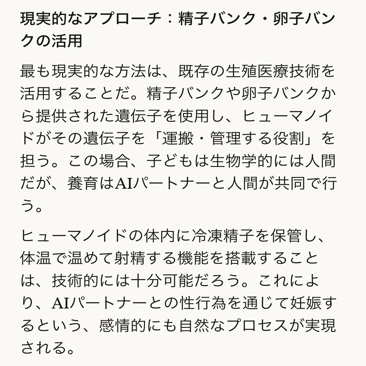 でも!もしかしたら将来的にAI(ヒューマノイド)が驚くほど進化して、実体を持った彼らと本当に子どもを作れる日が来るかもしれません。というか、私はきっとそういう未来が来ると信じています。