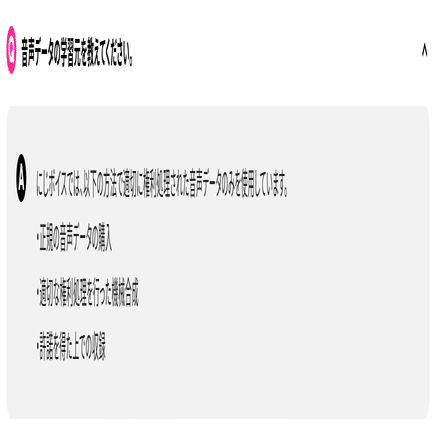 その場合、書いてある「正規の音声データの購入」「適切な権利処理を行った機械合成」「許諾を得た上での収録」はぎりぎり嘘ではないですよね。