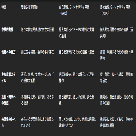 以下に、これまで論じてきた行動パターンとパーソナリティ障害の主な特徴を比較し、その差異を明確にします。この表は、直面している問題の性質をより正確に理解し、適切な対処法を選択するための一助となることを目的としています。