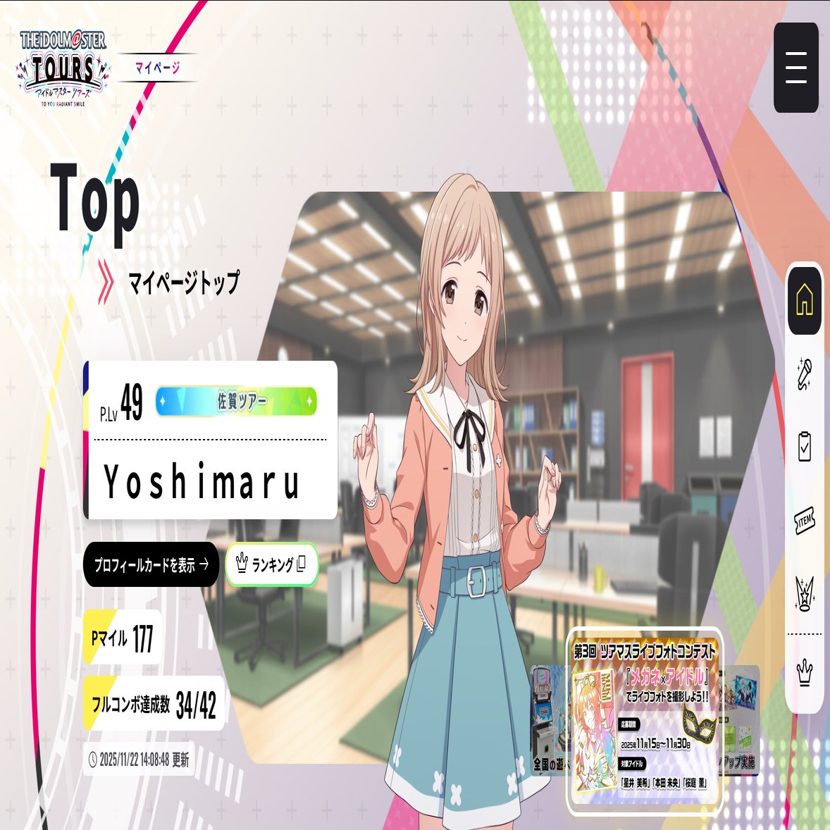 ツアマスに関しては、リリース当初から追いかけており、プレイ頻度は毎週一回は基本で今日はやるぞ!と決めた日は2、3千円を注ぎ込んでいます。カードは一部のSSRとパラレルを除いてはほぼコンプしておりリリース当初から現状までの変化やイベントの傾向も把握しておりツアマスに関する大抵の質問は答えられると自負しています。