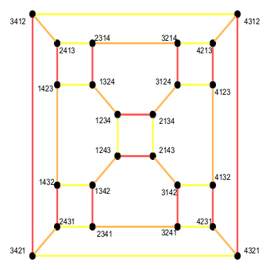 <赤:(1 2), 橙:(2 3), 黄:(3 4)> 3次と比較すると大分複雑になっていますが, 上のグラフは切頂八面体 と同型になっています. 切頂八面体とは, 正八面体の各頂点を切り落とした多面体で, 赤-黄の四角形が6つ確認できますが, これが八面体の頂点の切り口だと見れば, 切頂八面体と同型なグラフだと理解できるでしょう.