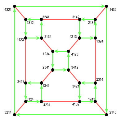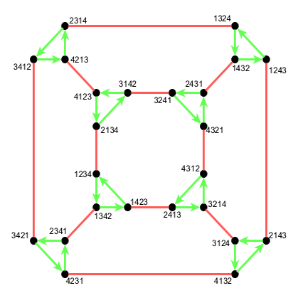<赤:(1 2), 緑:(1 2 3 4)> 先ほどと同じ切頂八面体ではありますが, 有向辺が紛れ込んでいます. こちらも\langle\begin{pmatrix}1&2\end{pmatrix},\begin{pmatrix}2&3&4\end{pmatrix}\rangle の時と同様に, 正四面体の回転と2点交換からなる操作の群だと解釈できますが, \begin{pmatrix}1&2&3&4\end{pmatrix} は正四面体を捻って回転させるという点で違いがみられます.