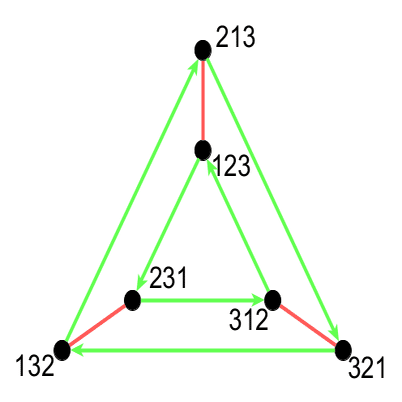 3次対称群 - 六角形, 三角柱 3次対称群に対して操作を行うと以下のような列が出来上がります. \begin{pmatrix}1&2&3\end{pmatrix} から始めていますが, \begin{pmatrix}1&3&2\end{pmatrix} から始めても議論は同様に進み, Cayleyグラフは同型になります.