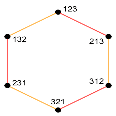 <赤:(1 2), 橙:(2 3)> 見ての通り, グラフは六角形 になっており, 対角線の移動は\begin{pmatrix}1&3\end{pmatrix} に, それ以外の移動は長さ3の巡回置換\begin{pmatrix}1&2&3\end{pmatrix},\begin{pmatrix}1&3&2\end{pmatrix} に対応しています. \begin{pmatrix}1&2\end{pmatrix} と\begin{pmatrix}2&3\end{pmatrix} だけでは限られた操作しか許されず, 考えられるのは, どちらの互換を先に計算するか, 2つの互換を何回重ねるかというパラメータのみで, かつ自由群のように無限に2つの互換を重ねることはできず, どちらから始めても必ず6回で元に戻ってしまうため, 1次元の線分の端と端が繋がり, 六角形になっていると解釈できます.