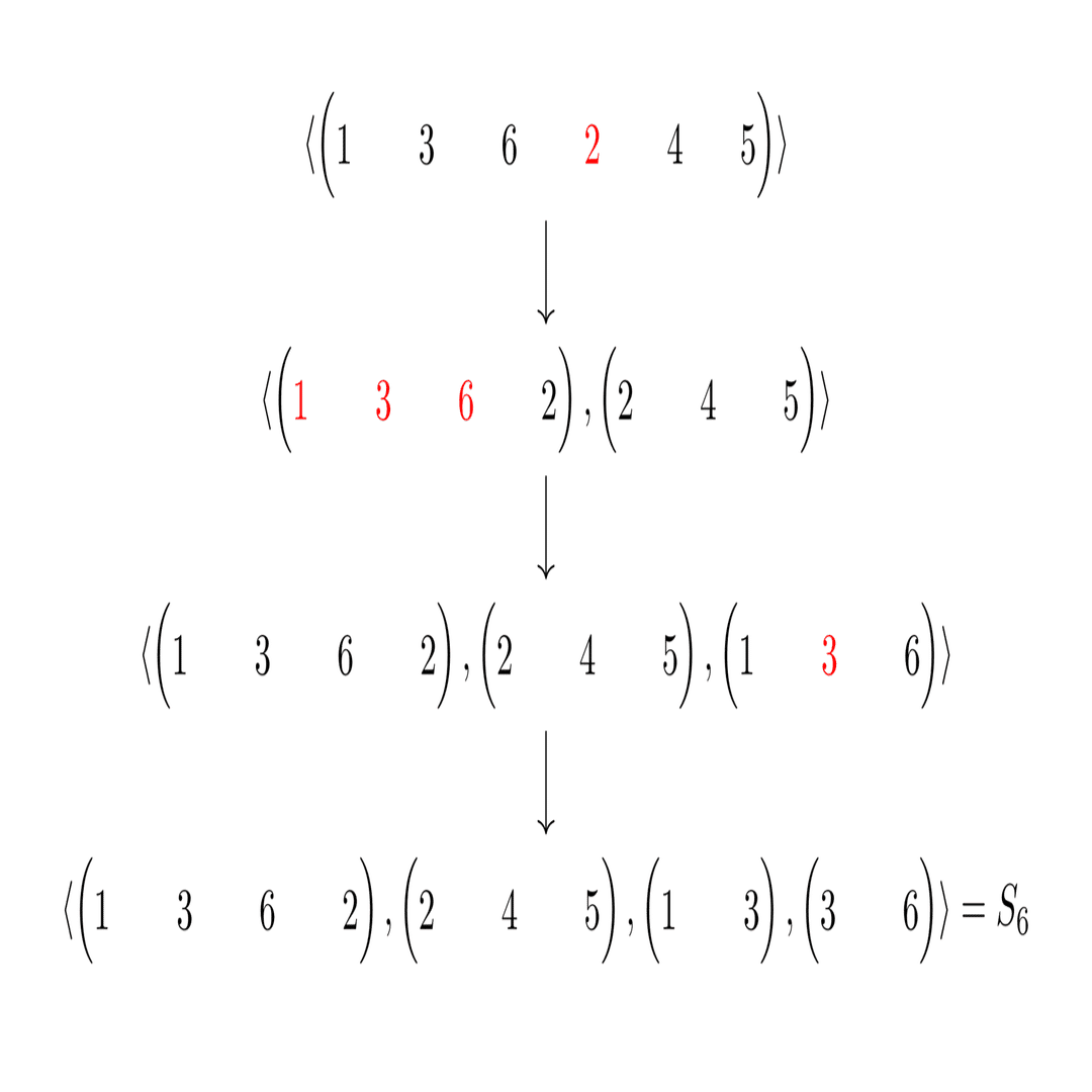 と, そのまま\begin{pmatrix}1&3&6\end{pmatrix} が加えられます. 実は, このような操作を順繰りに行っていったとき, 生成系の中に互換が現れればその生成系は対称群全体と等しくなるということが示せます. 厳密な証明は以下の記事をご覧ください.