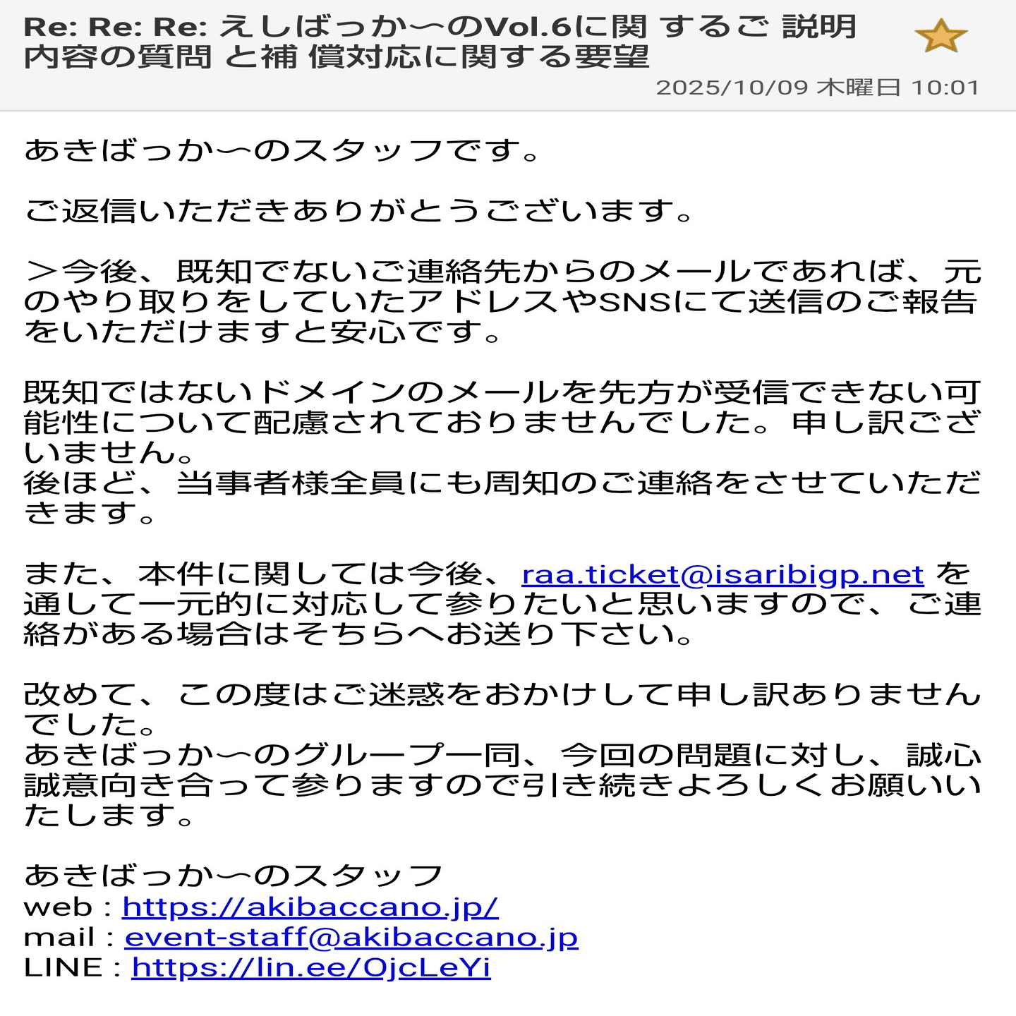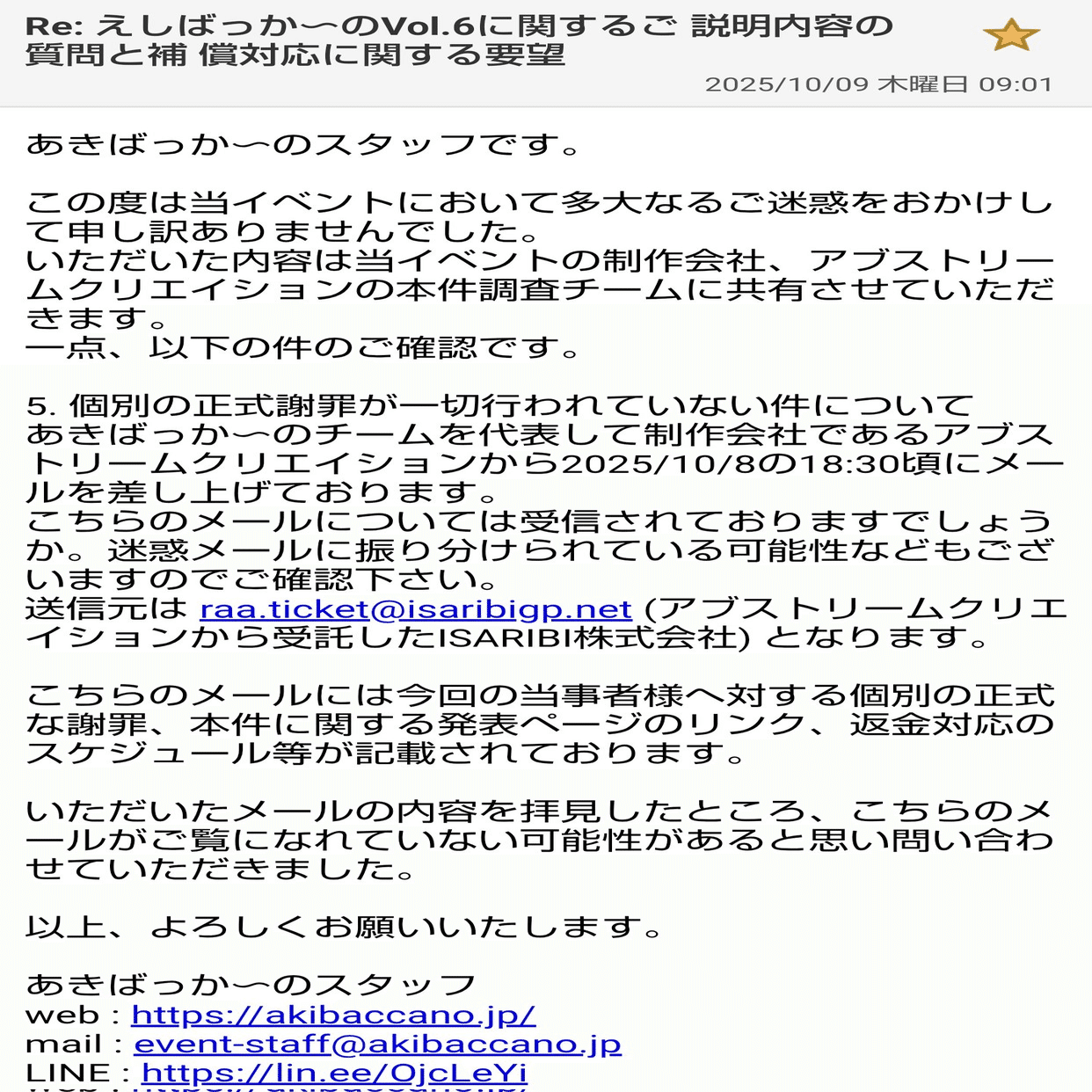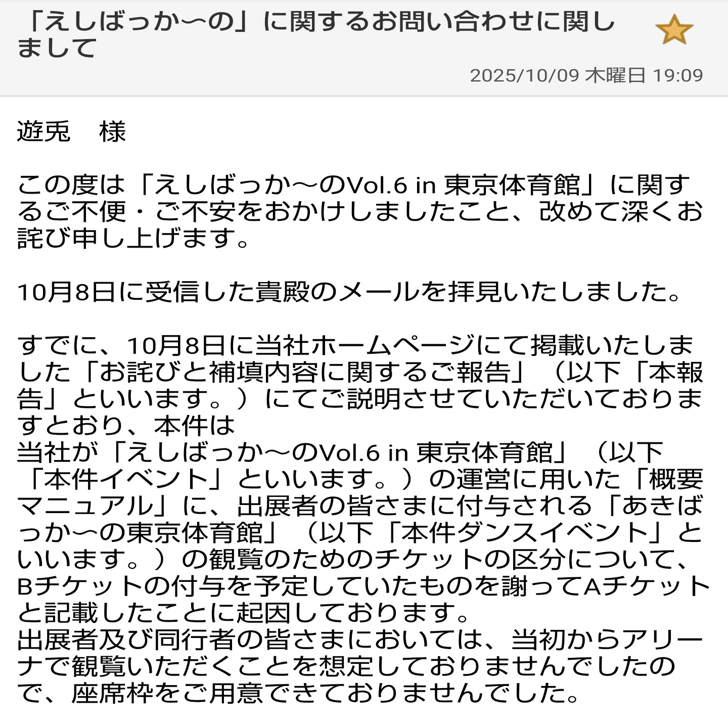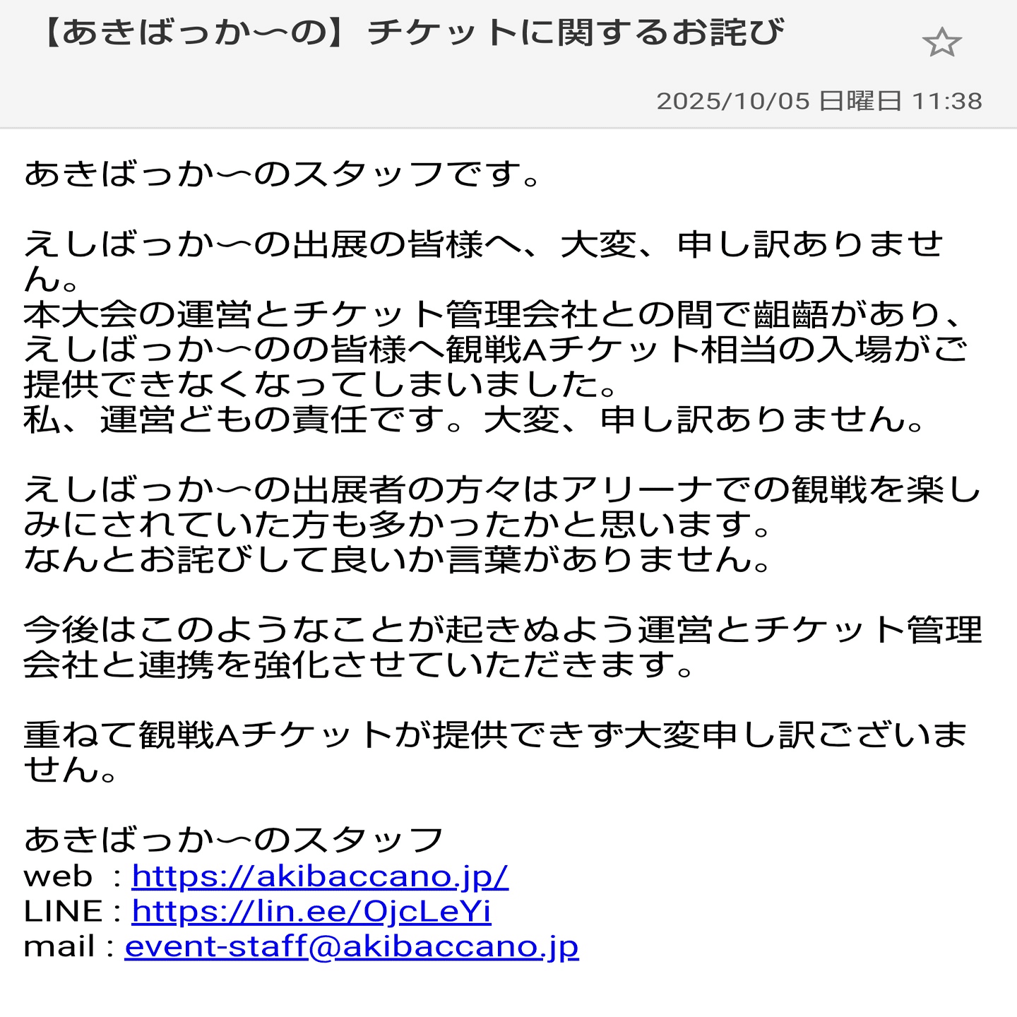 2025年10月5日に開催の「あきばっか〜の東京体育館」内サブコンテンツ「えしばっか〜のVol.6 in 東京体育館」で発生した運営トラブルをきっかけに、企業の対応、行政の限界、そして「推し活」における消費者の立場の弱さを実感するに至りました。