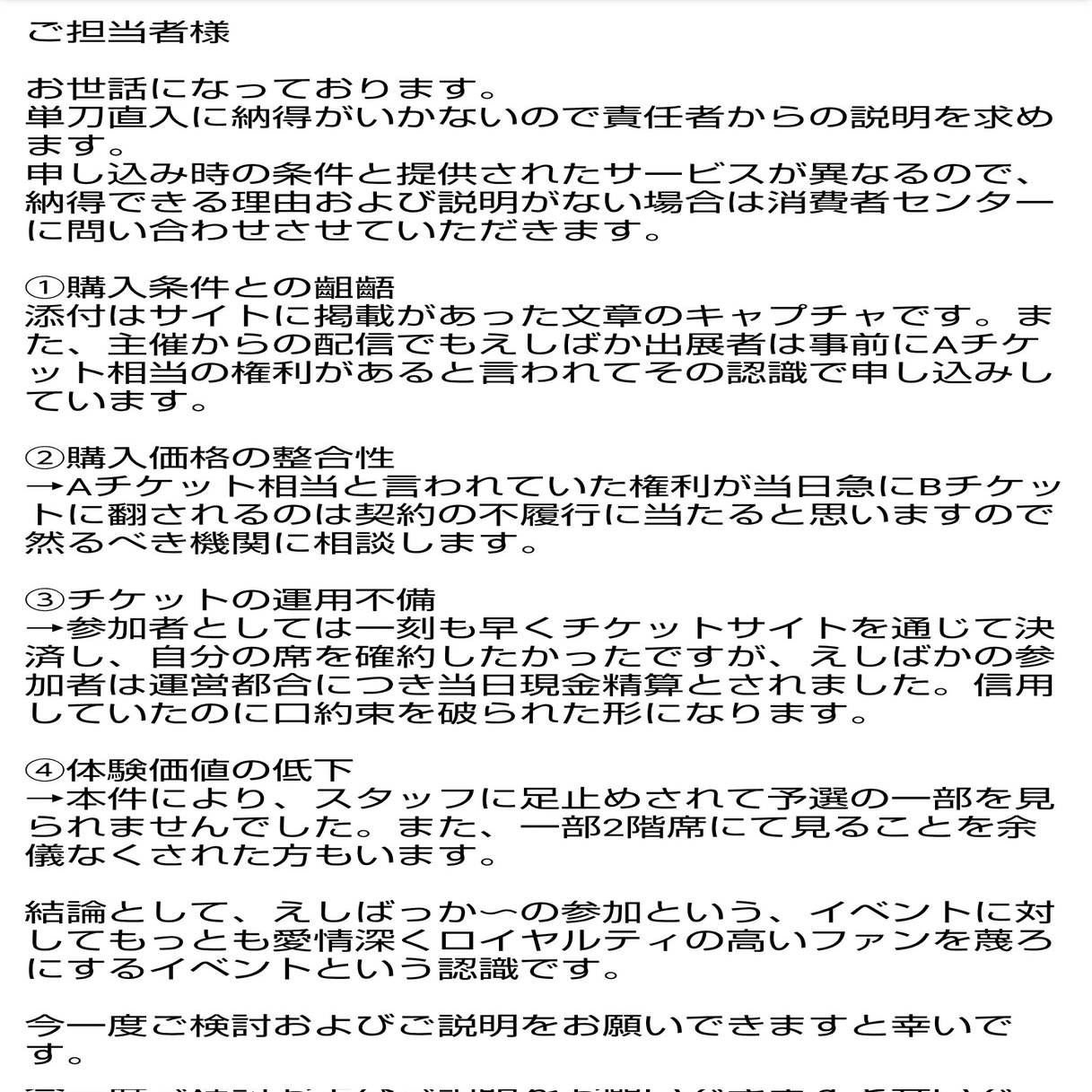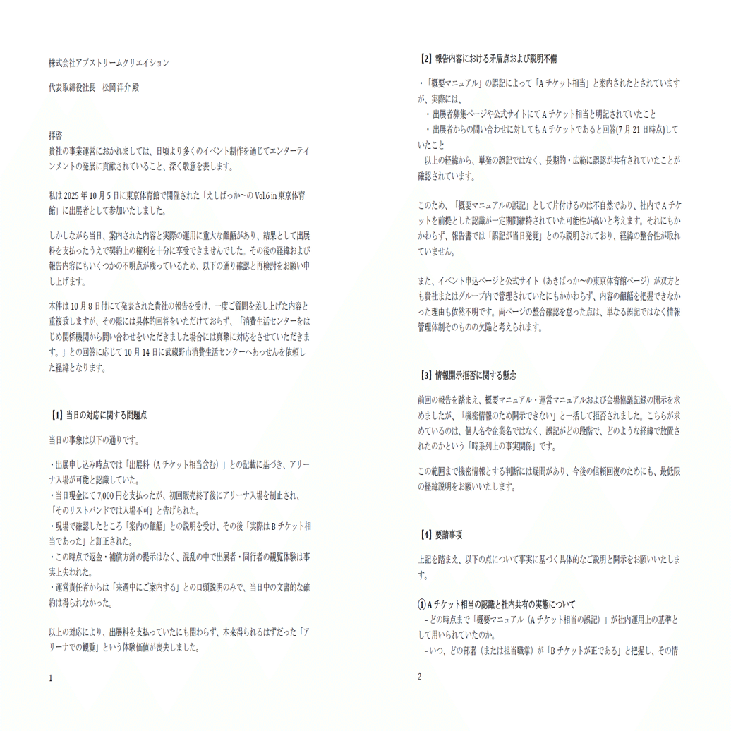 「えしばっか〜のVol.6 in 東京体育館」出展における運営トラブルの経緯と消費生活センターからのあっせんを含む対応報告