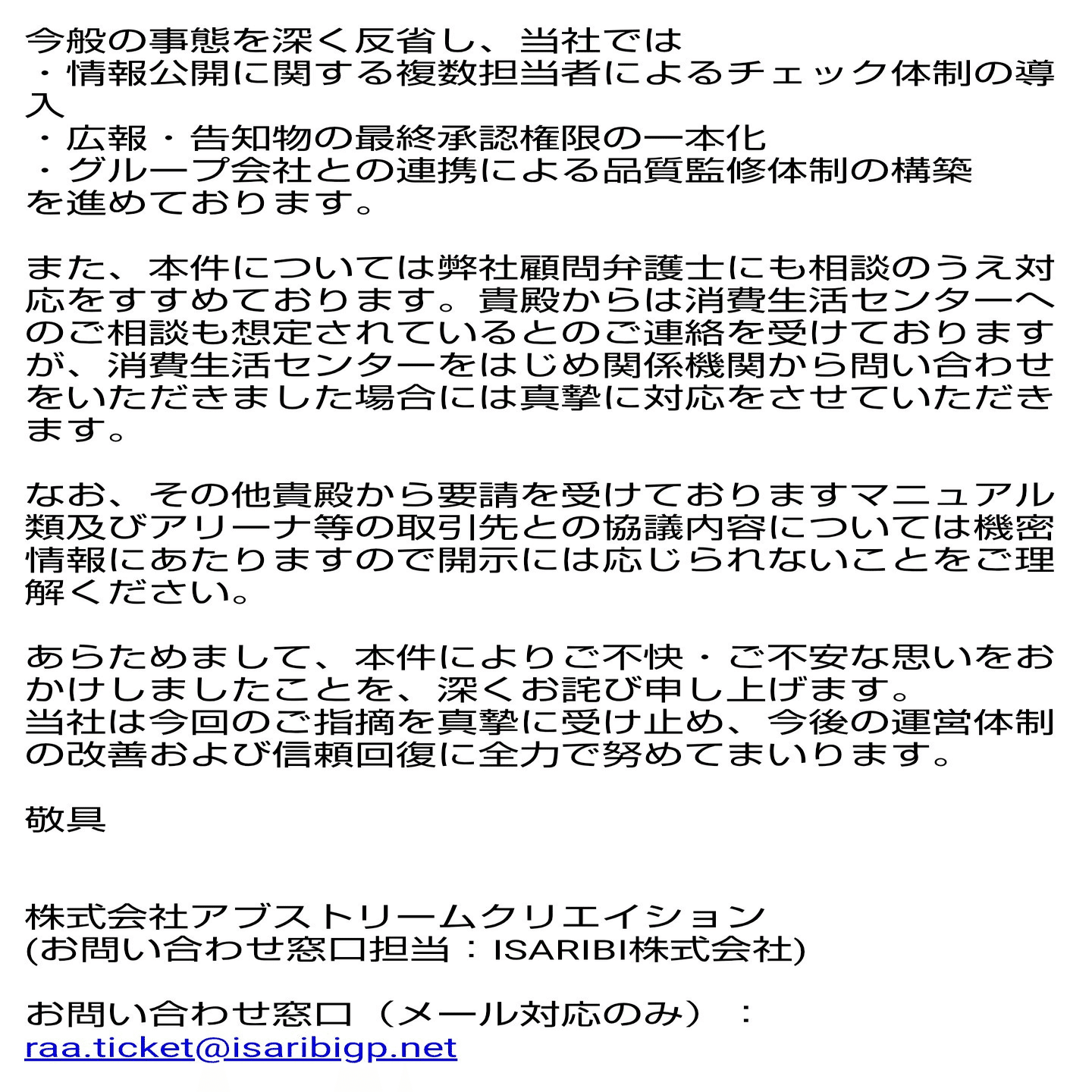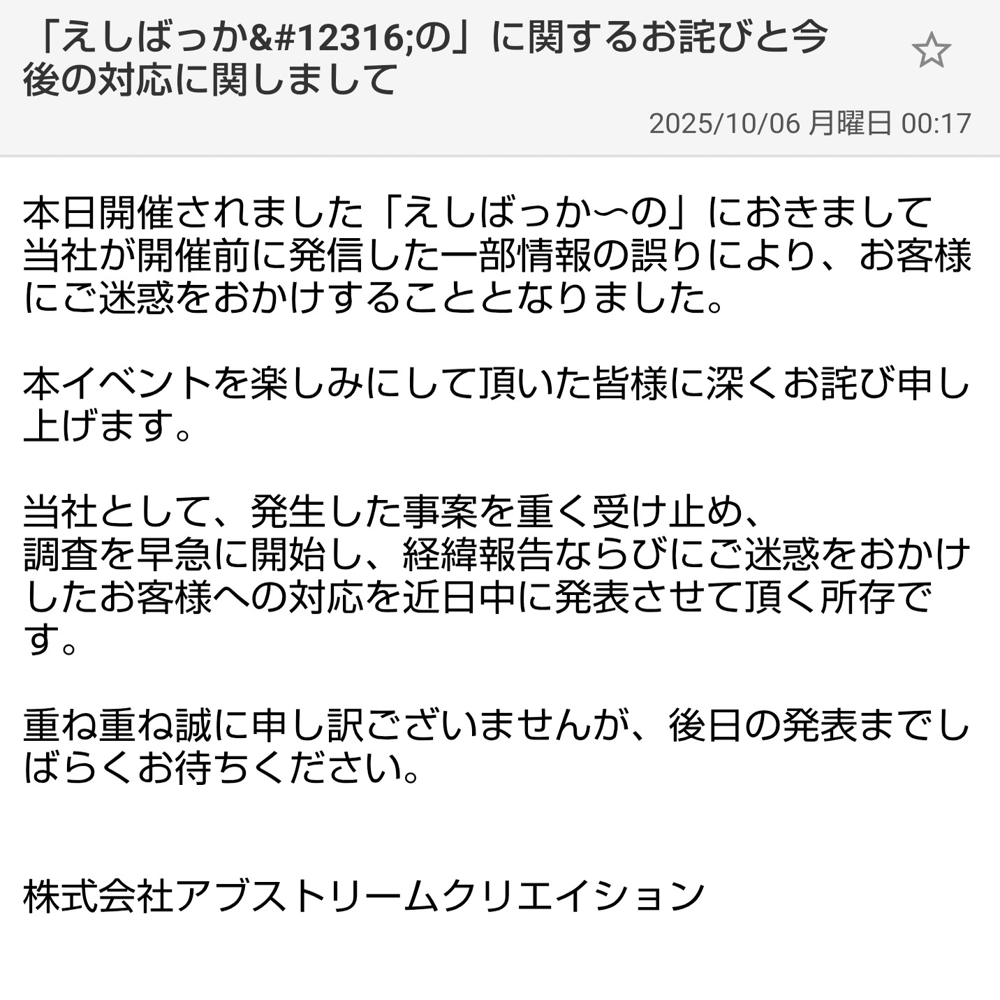 株式会社アブストリームクリエイションによる謝罪・報告の要点は以下です。