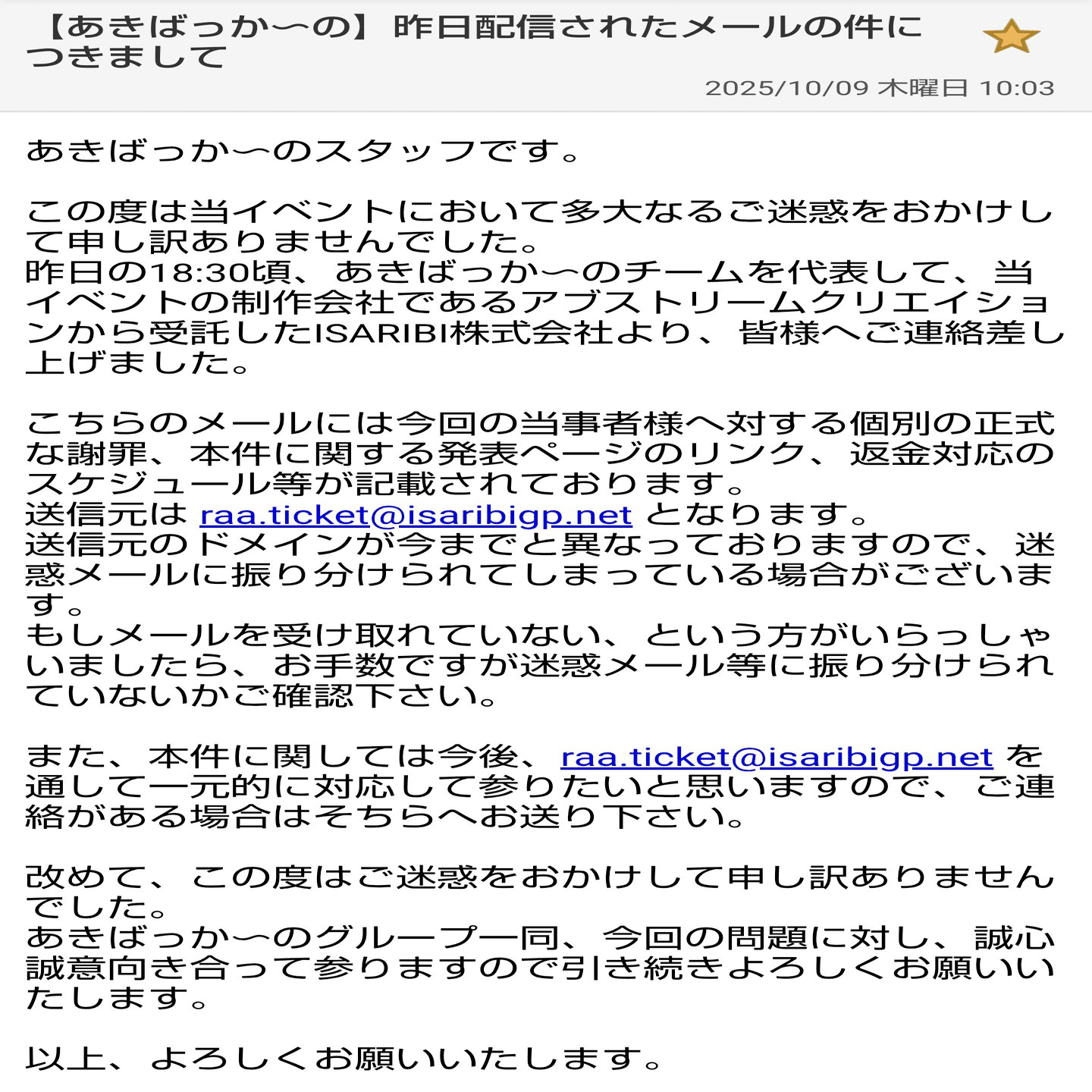 【当日の夜、主催の株式会社アブストリームクリエイションより受信したメール】
