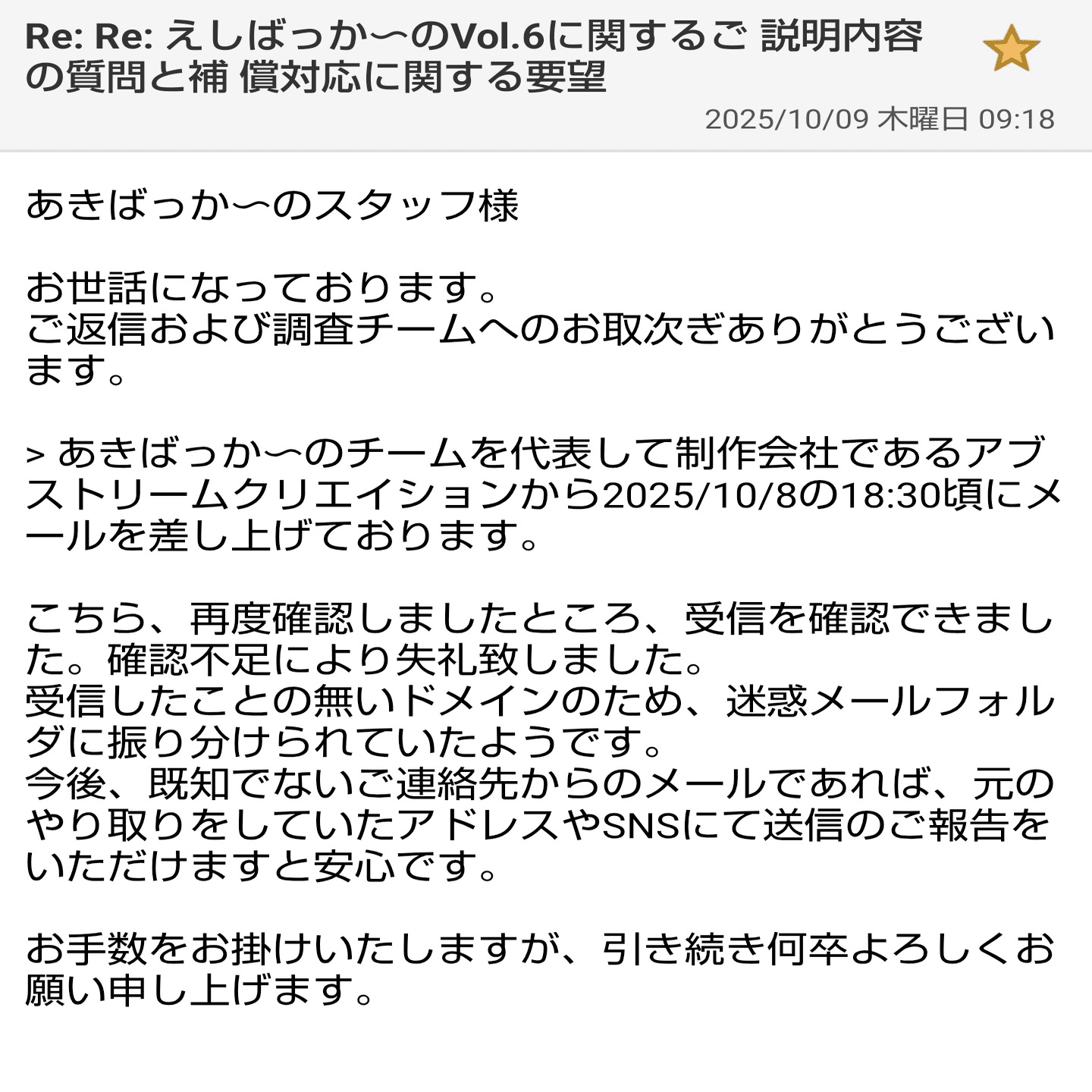 かつ、ただ謝るだけでは問題の根本的解決には繋がりません。アブストリーム社の場合はここがすべてのコミュニケーションのズレになっていて、謝るだけで改善の様子があまり見られない(ミスが頻繁に再発している)ことがファンのフラストレーションにも繋がっていると思います。