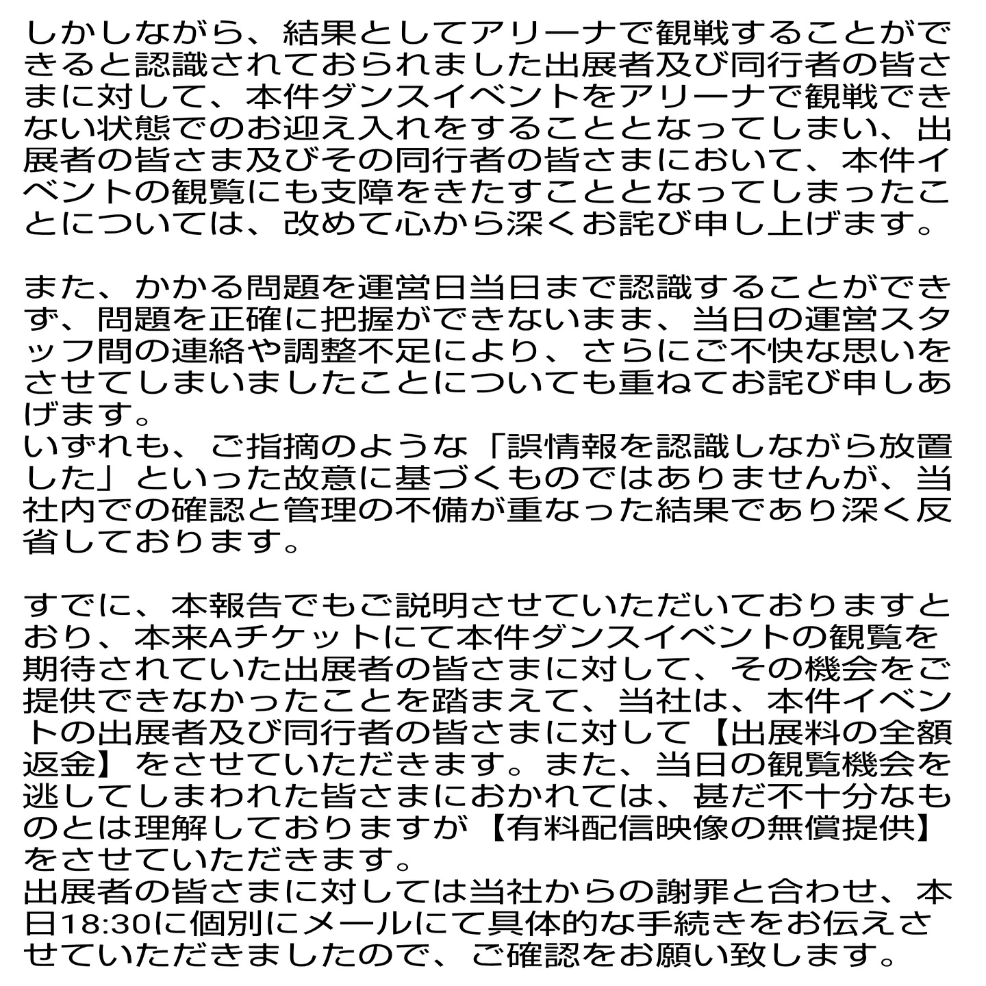 アリーナ人数は会場・関係各社・消防と厳格に協議されており、当日になって追加することはできなかったと説明。