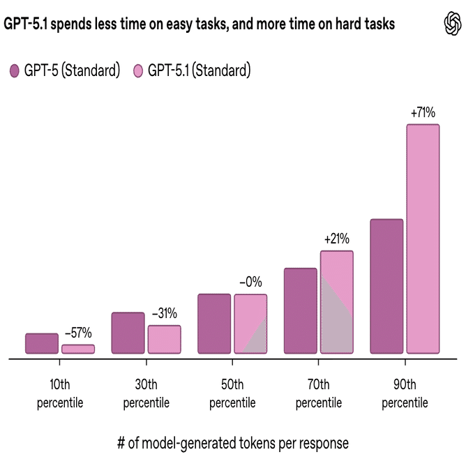 思考モデルも「GPT-5.1 Thinking」にアップグレードし、日常的な使用においてより効率的で理解しやすいものを目指しています。これにより、質問に応じて思考時間をより正確に調整できるようになり、複雑な問題にはより多くの時間を費やし、より単純な問題にはより迅速に対応できるようになります。具体的には、難しい質問にはより綿密な回答が得られ、単純な質問にはより少ない待ち時間で回答できるようになります。