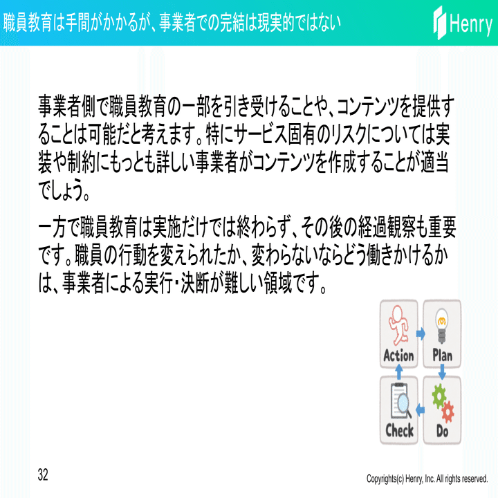 特に職員教育がサイバーセキュリティを高めるための鍵になること、職員教育を事業者で代行することが現実的でないことを踏まえると、医療機関側が一定の主導権を握ることが必要です。事業者からは観点の補足や、製品・サービス固有の知識や教育用コンテンツを提供をし、責任分解点や運用について相互に合意を形成していくことが理想的ではないでしょうか。