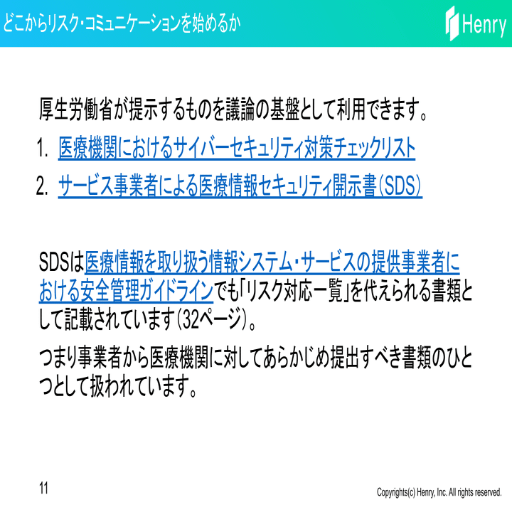 加えてサービス事業者による医療情報セキュリティ開示書(SDS)も事業者から提出させることで、事業者と確認をすべきことも明確になります。何がわかっていないか、何をしなければならないのか、どんなコミュニケーションが求められるのかという「リスク・コミュニケーションのはじめかた」をこれらの書類によって明らかにできるということです。