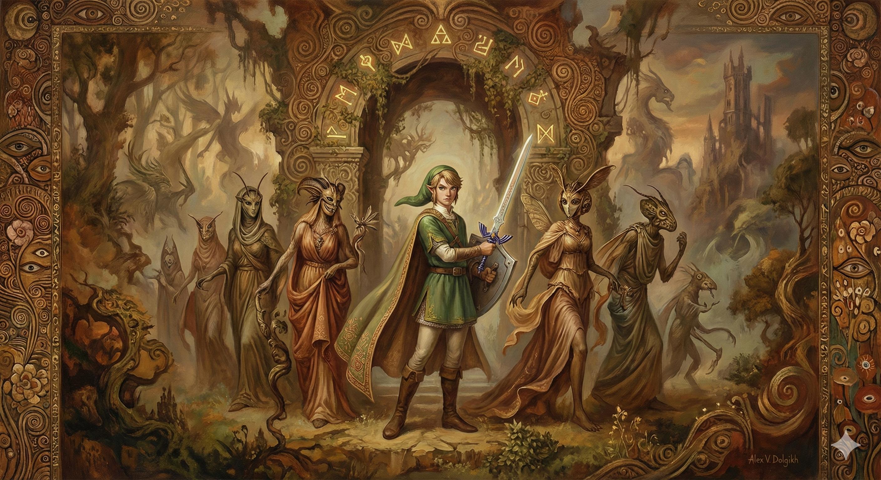 {Link (The Legend of Zelda)} illustrated as a Neo-Symbolist painting in the style of Alex V. Dolgikh—a mythological dreamscape staged with theatrical precision, theatrical academic realism symbolically and optically composed akin to geometric abstraction to parallel visceral insect dramaturgy ad visualize the extreme depths of the human psyche: {