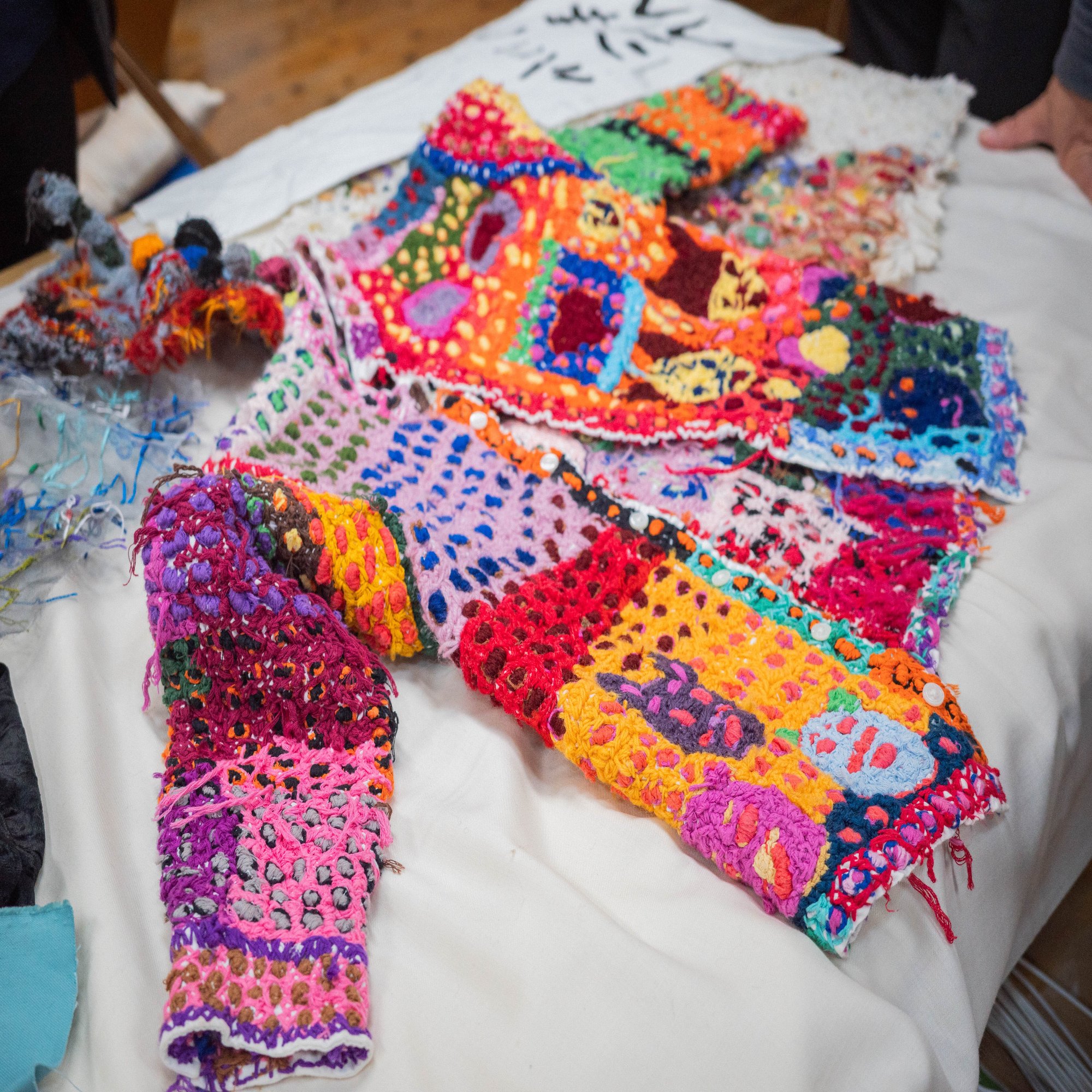 工房には、若い職員さんがひとりいた。彼女も刺繍をしていた。利用者さんが刺繍を終えたものを、一枚の作品になるよう繋げたり、糸をきれいに始末したりするらしい。