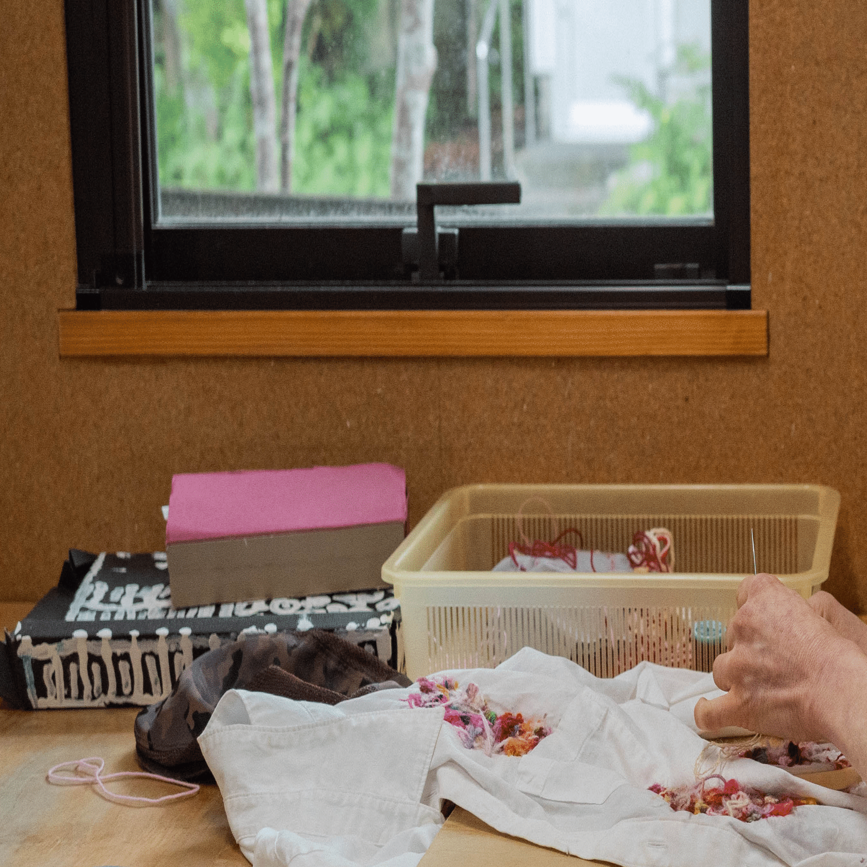長机の上には色とりどりの糸と布が散らばっていた。窓からは、木々に反射した光がやわらかくさしこむ。その光の中で、障害のある利用者さんたちがチクチクしていた。