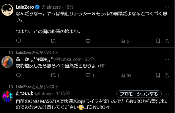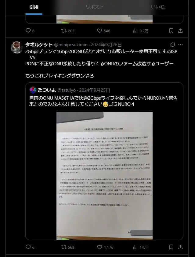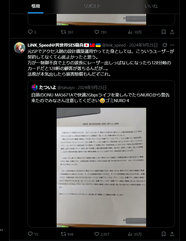 技術的な危険性: 引用リツイートにある通り、PONネットワークにおいて規格外の機器を接続することは、同一の光ファイバーを共有する**他の契約者の通信を妨害する(最悪の場合、物理的にダウンさせる)**現実的なリスクを伴います。