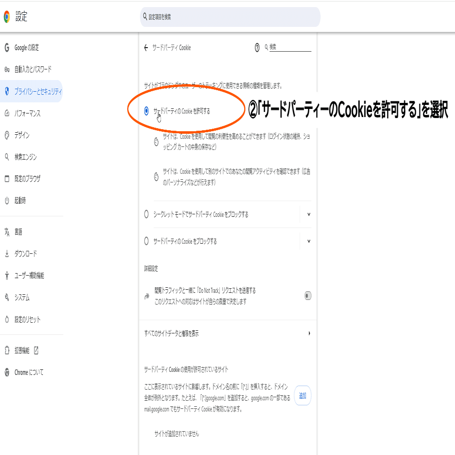 2.「サードパーティーのCookieを許可する」を画像の通りに選択し