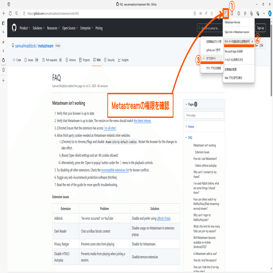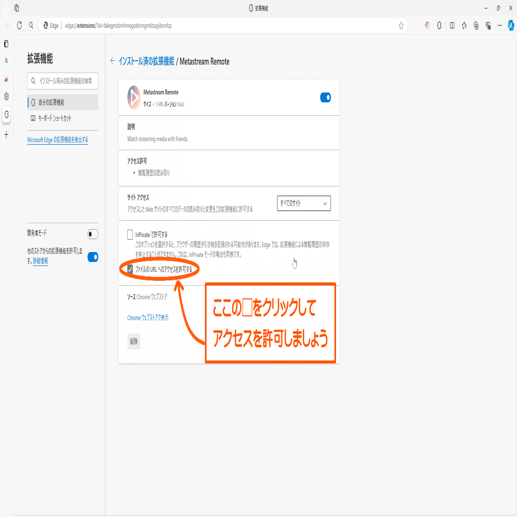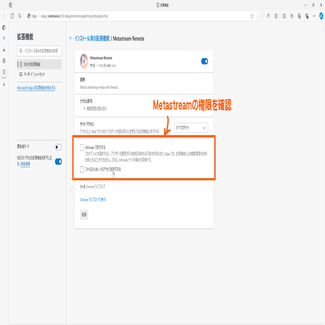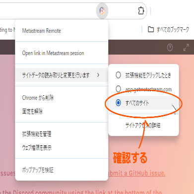 ・最新バージョンはここから確認出来ます(Chromeの場合)はMetastreamの拡張機能に対し、「すべてのサイト」へのアクセス権限を許可していますか?