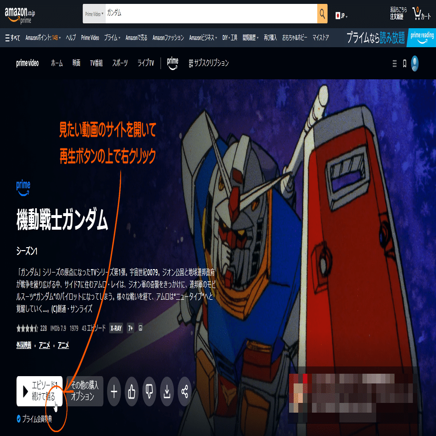 見たい動画サイトを開いたら、再生ボタンの上で右クリックします