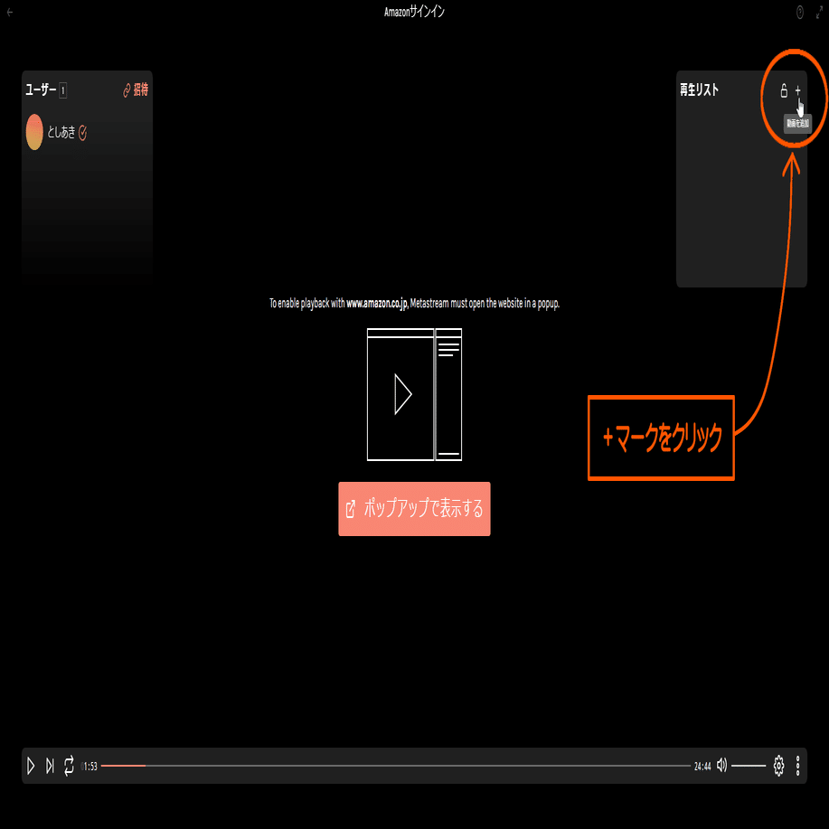 次にMetastreamのページへ移動して+マークをクリックします