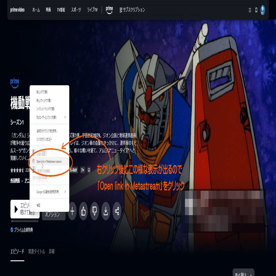 中から「Open link in Metastream」をクリックしましょう。