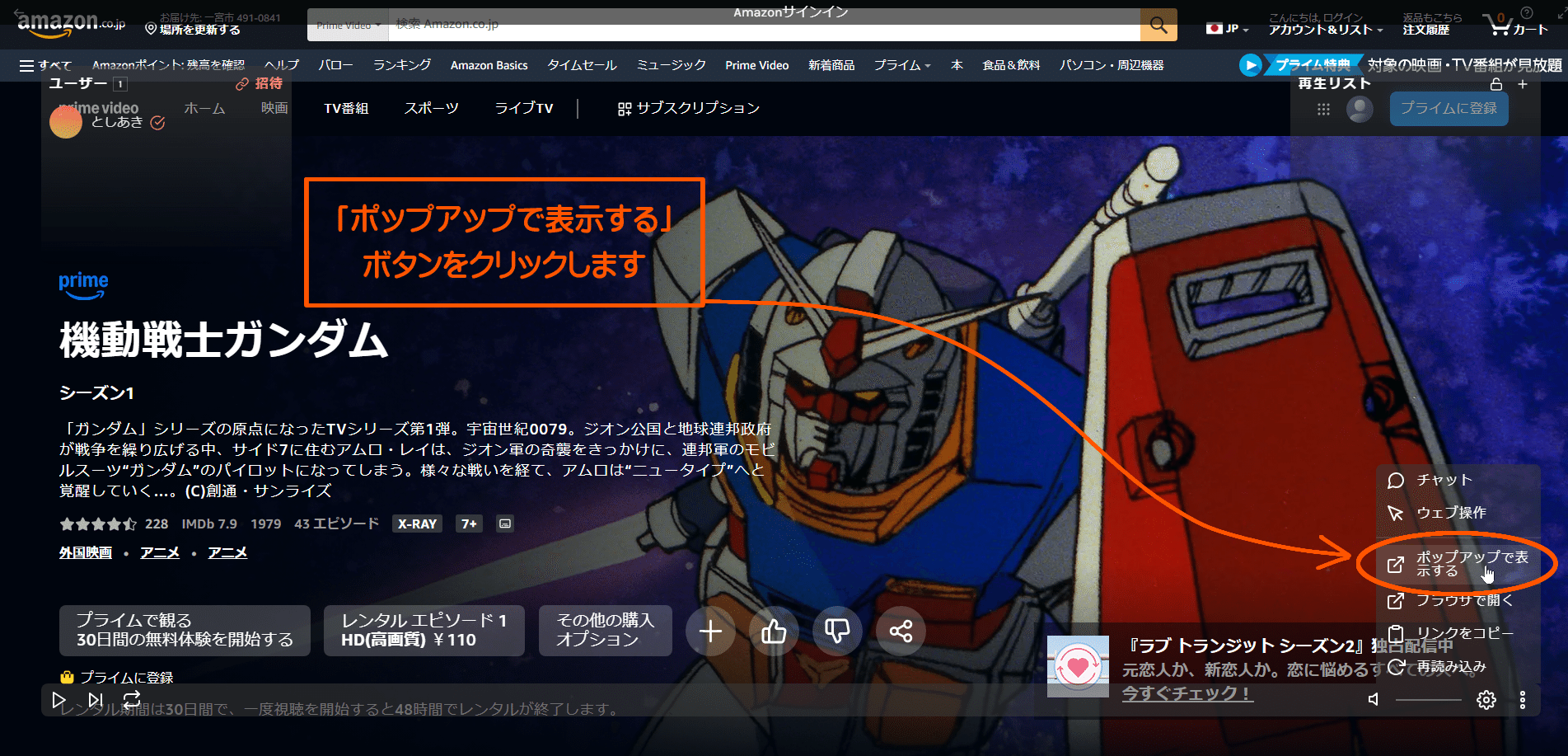 すると「ポップアップで表示する」との表記が出てきますので