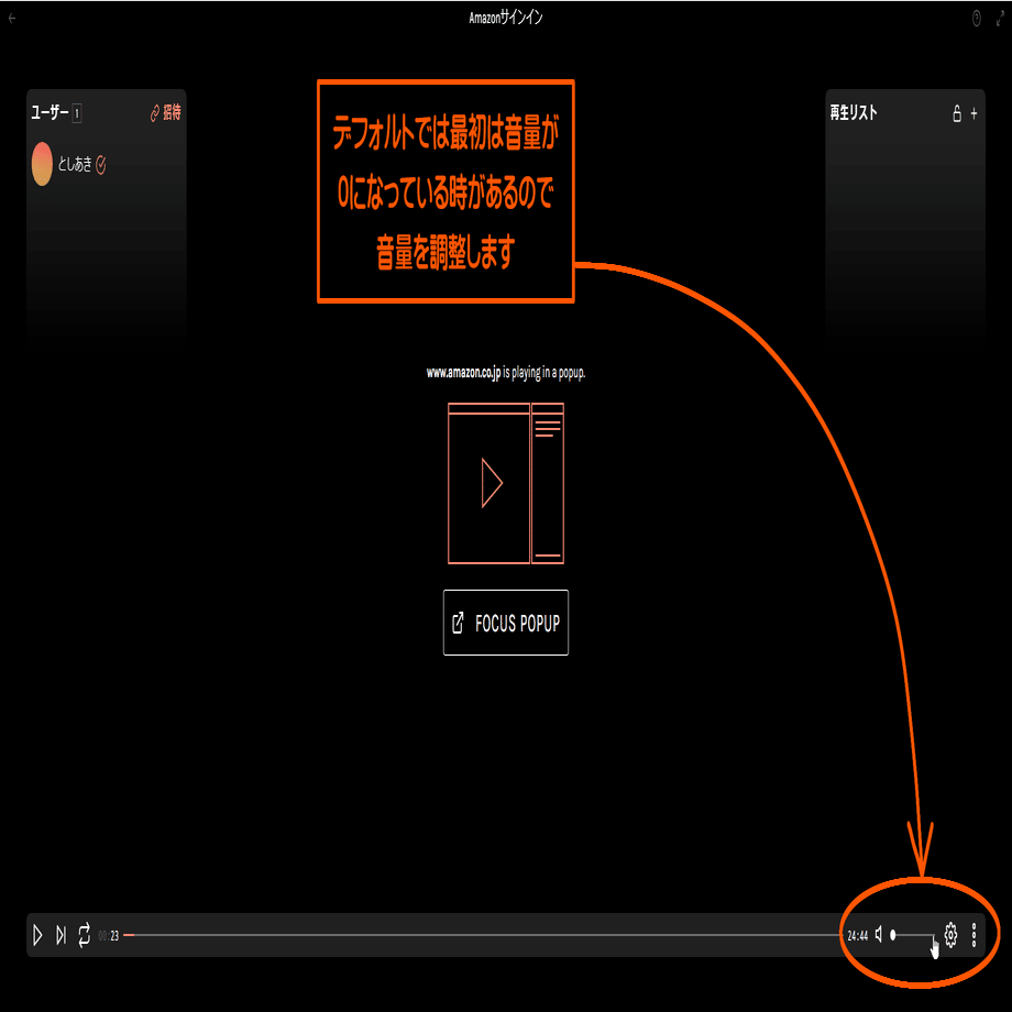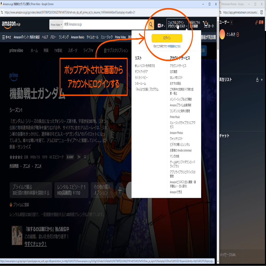 ポップアウトした画面から、配信サービスへのログインを行いましょう。