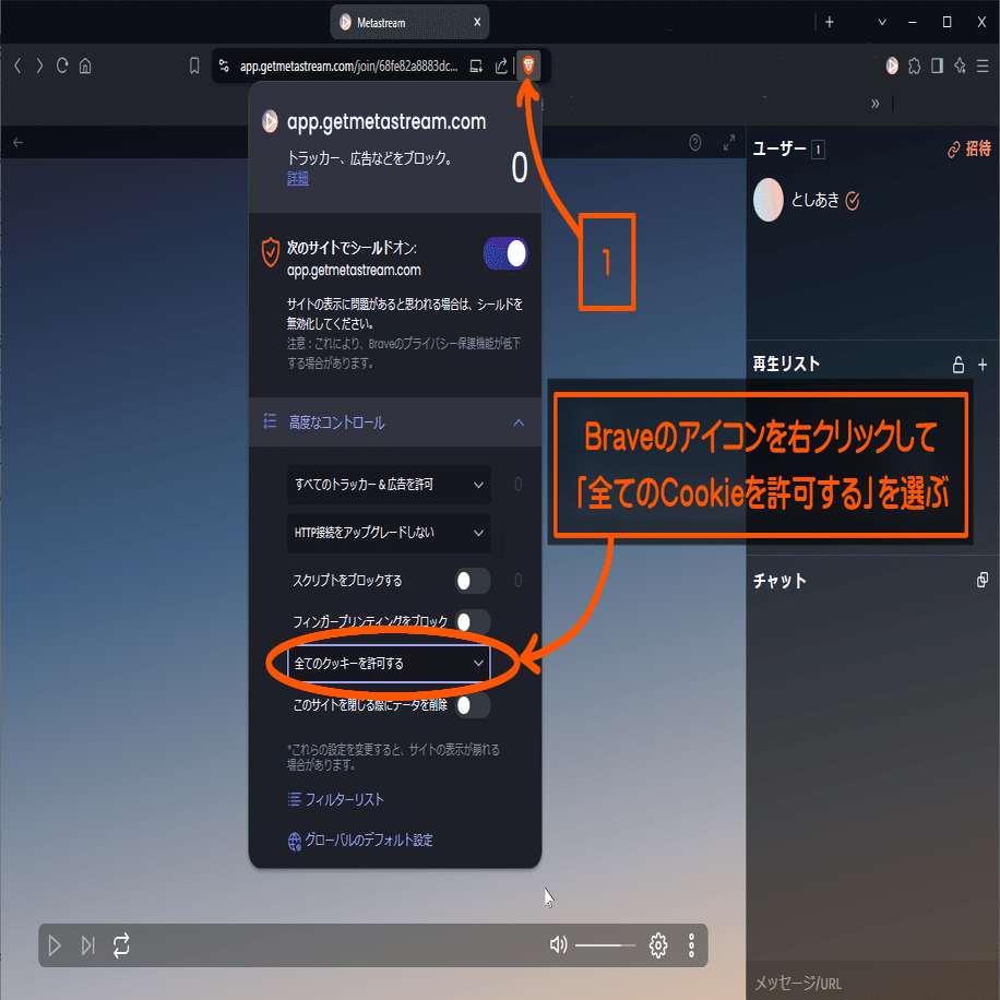 Braveが「すべてのクッキーを許可する」状態にあるかを確認します。