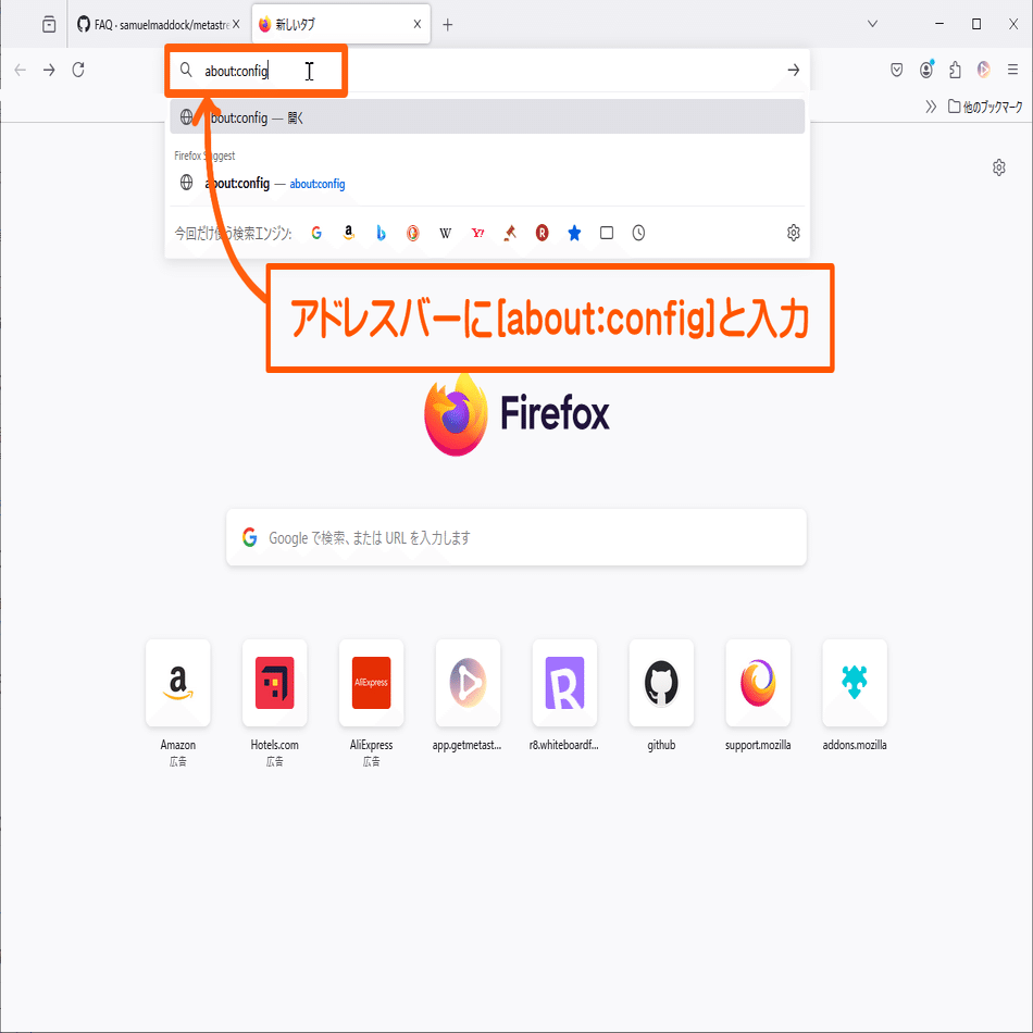 まず、アドレスバーに以下の文をコピペしてEnterキーを押しましょう