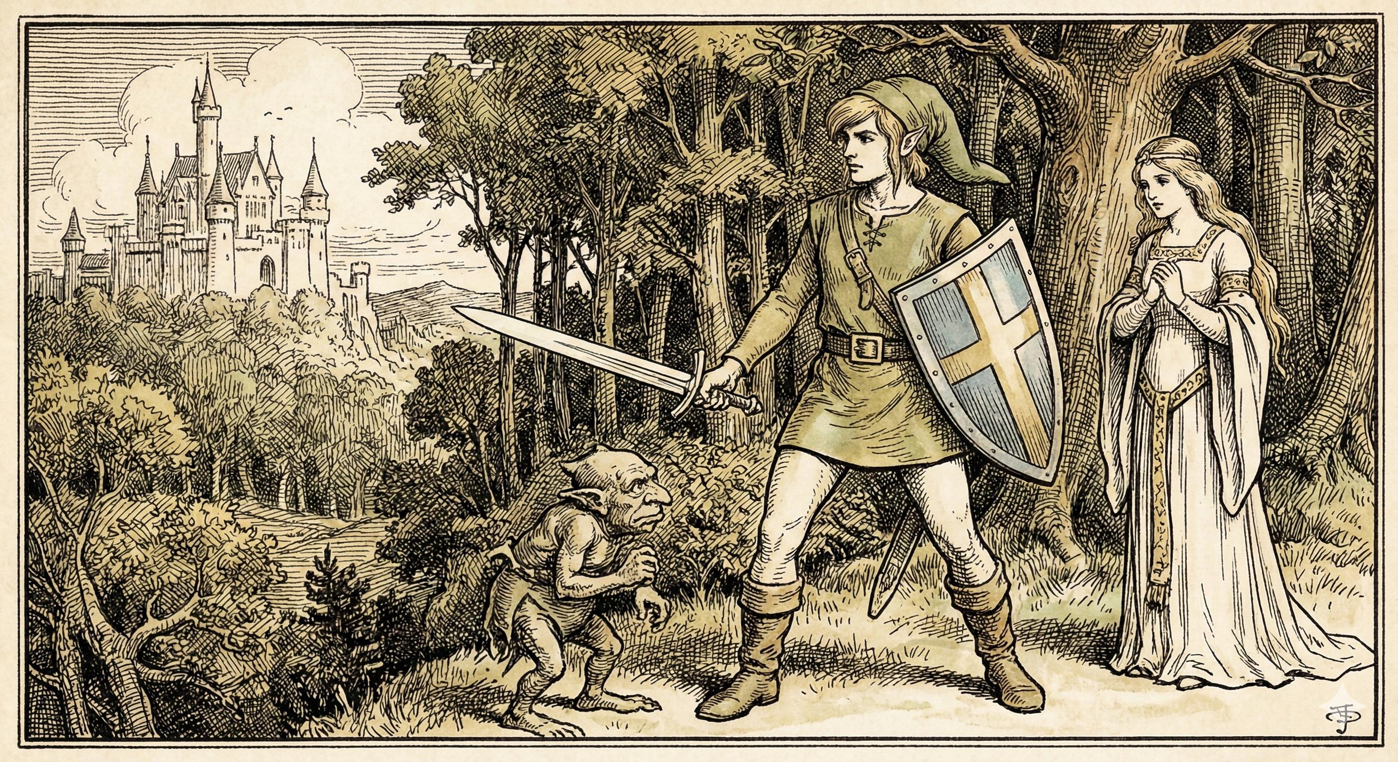 {Link (The Legend of Zelda)} illustrated in the color-washed pen-and-ink narrative illustration style of Henry Justice Ford (1860–1941): {