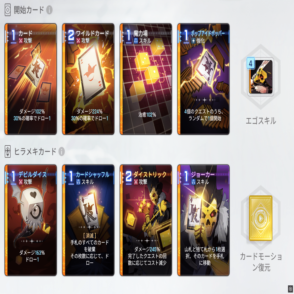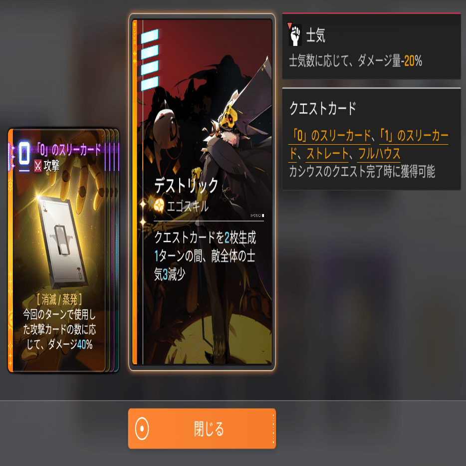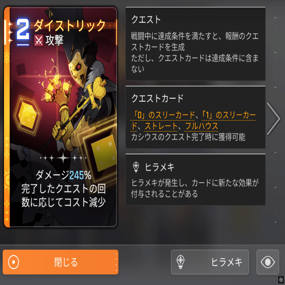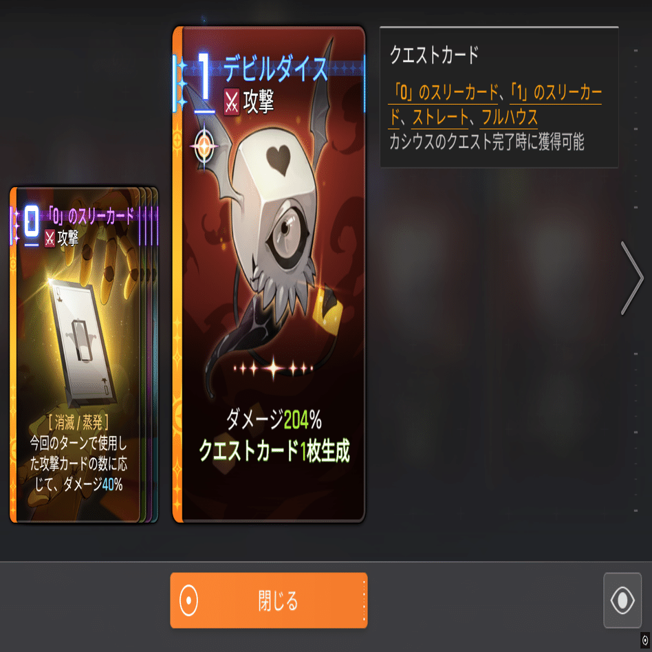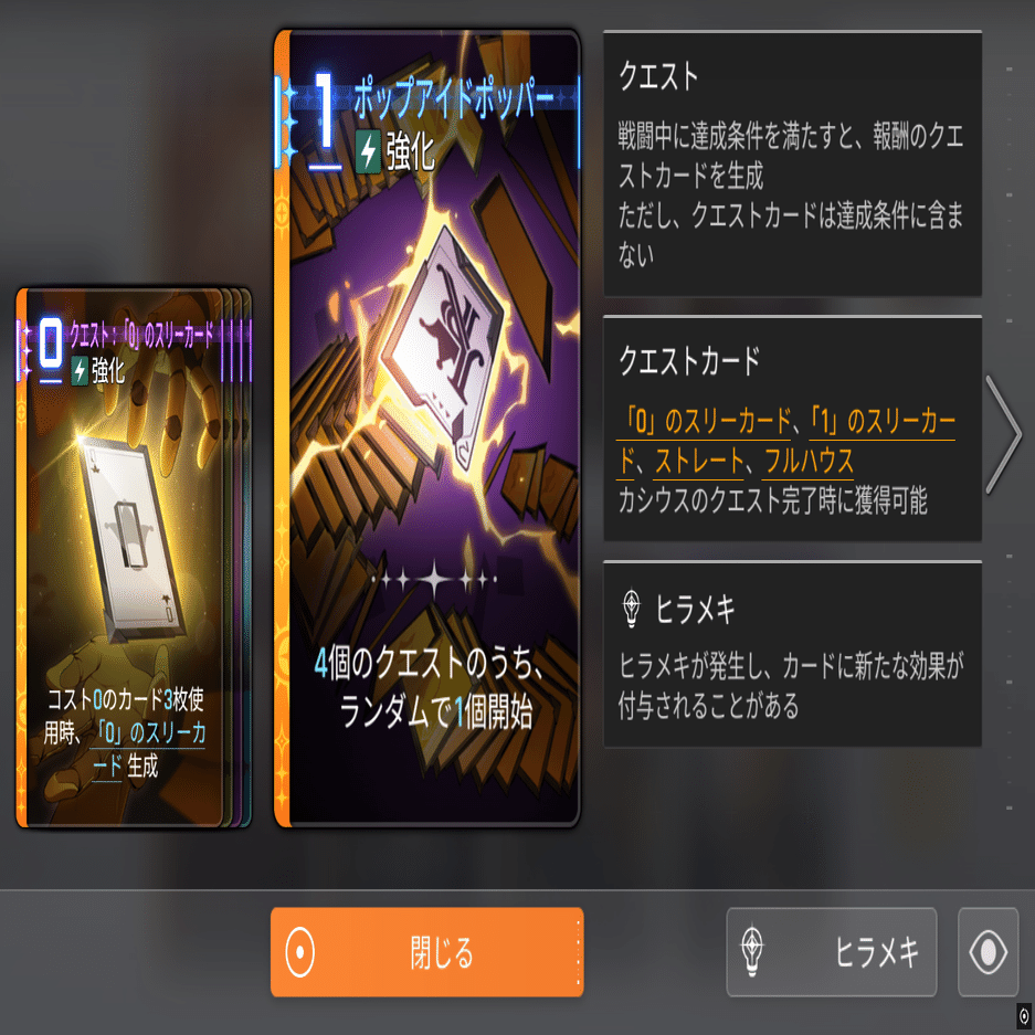 クエスト:戦闘中に達成条件を満たすと、報酬のクエストカードを生成する。クエストカードは達成条件に含まない。