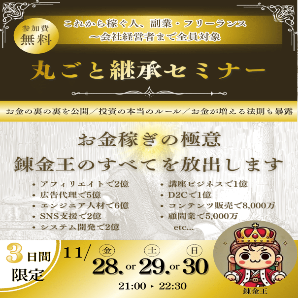 このセミナーでは、そのお金稼ぎの極意、裏の裏、投資の本当のルールまで。 文字では書けなかった真実を、余すことなくすべて放出します。