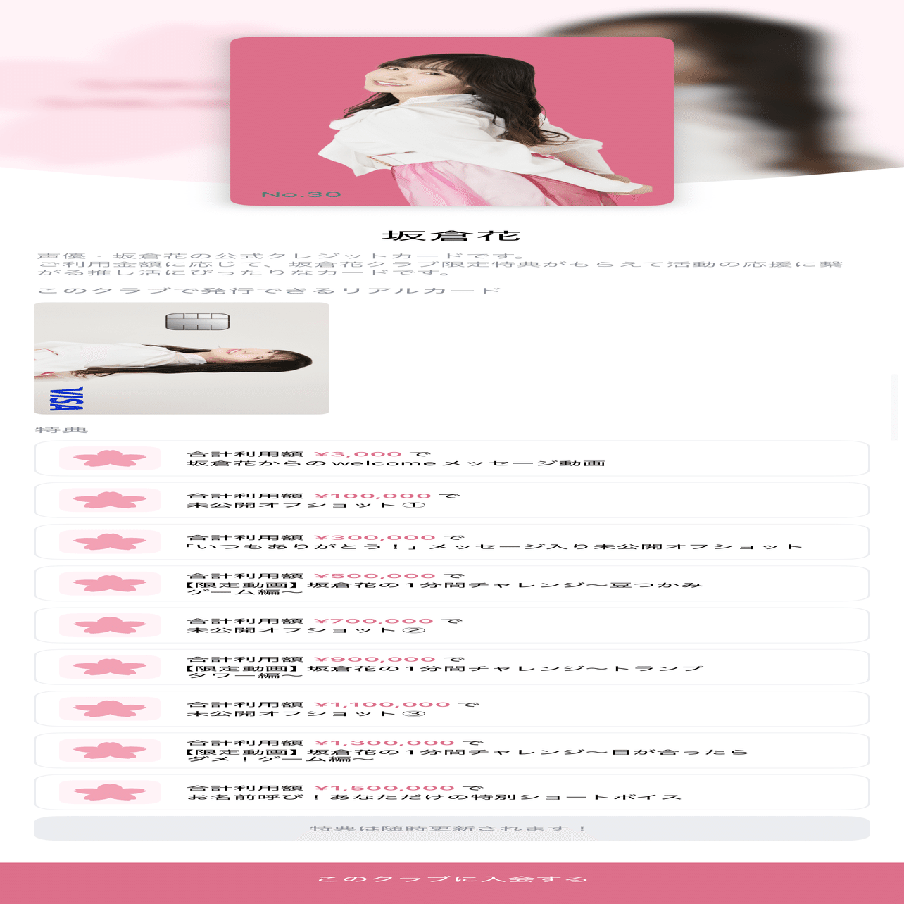 坂倉花公式クレジットカードもこのスキームに基づいており、利用額の一部が”坂倉花の活動資金”として還元される設計となっていた。加えて、3,000円以上の累計利用者には、坂倉花による限定メッセージ動画や未公開オフショット、ショートチャレンジ動画、さらには名前を呼ぶ音声メッセージなどの特典が用意されていた。