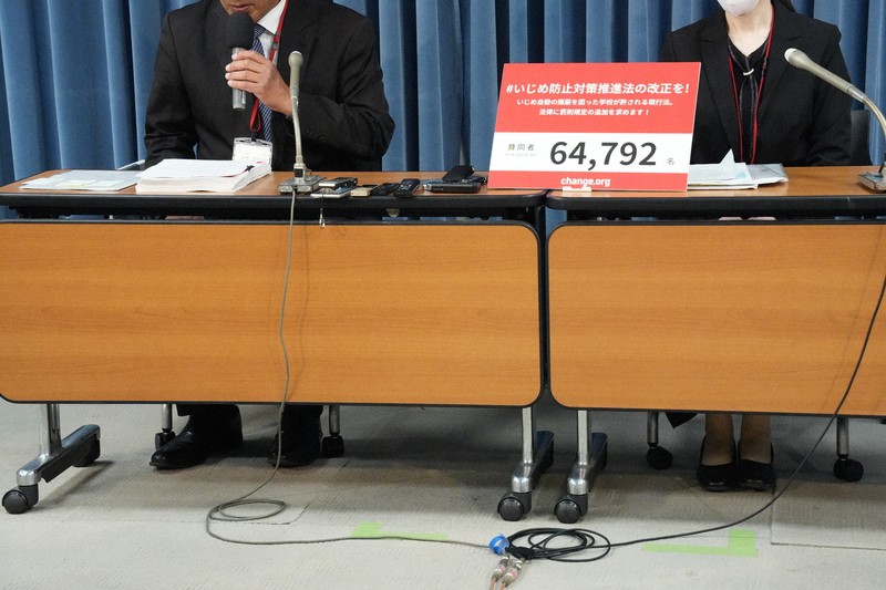 署名は、法に基づく「いじめ重大事態」の調査結果が隠蔽(いんぺい)されたり虚偽だったりした場合に、学校を設置する法人や自治体に対する罰則を科す法改正を求める内容。23年12月からオンラインで集めた。