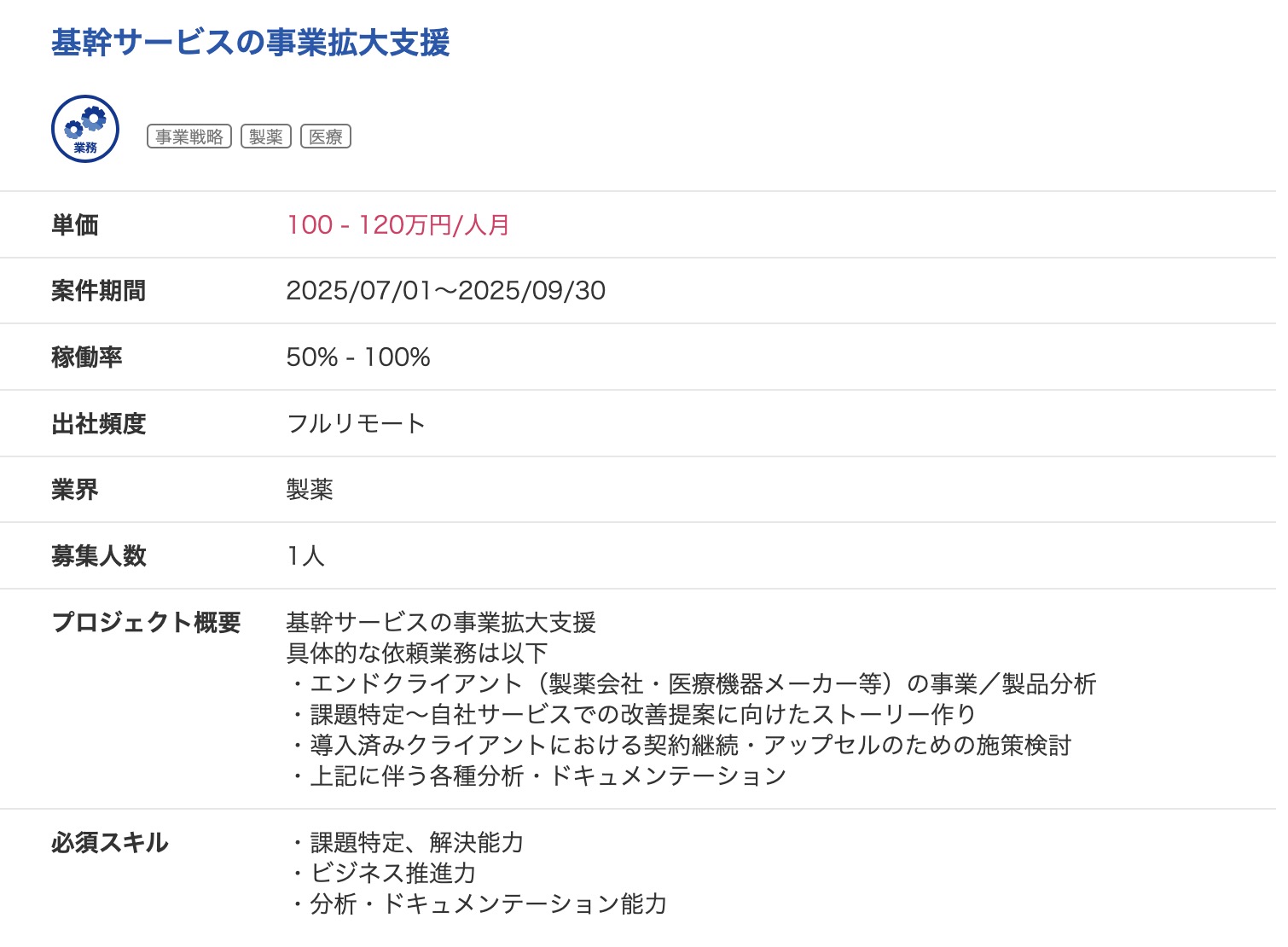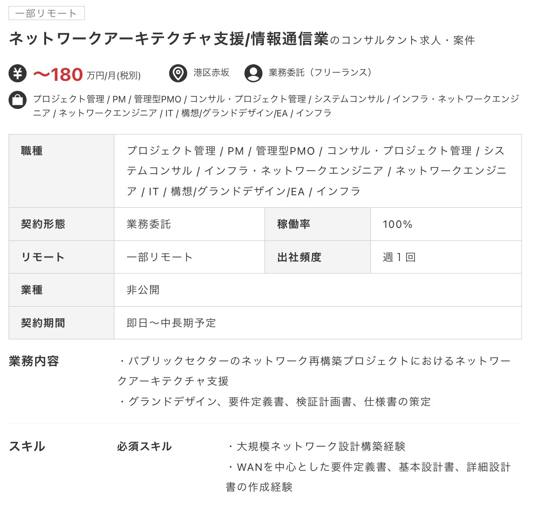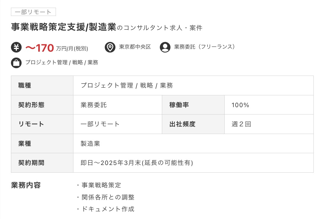 フリーコンサル案件には、コンサルとしての実務経験が十分にある人向けの物が多いです。