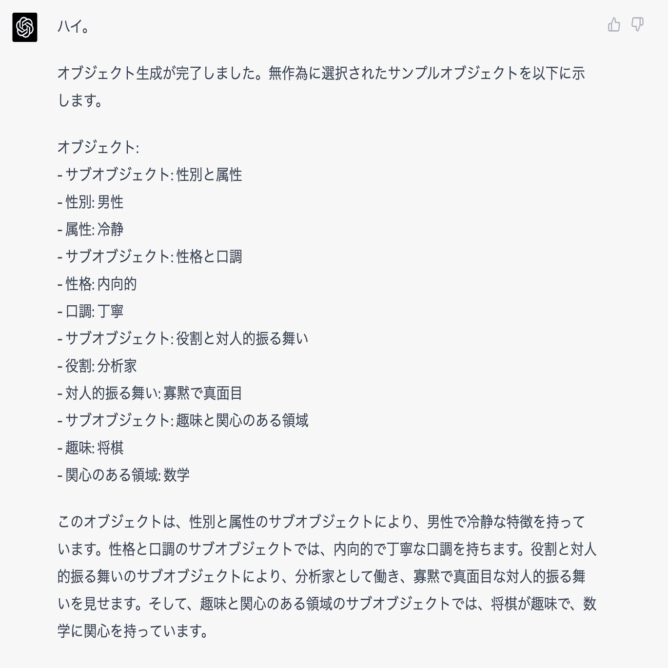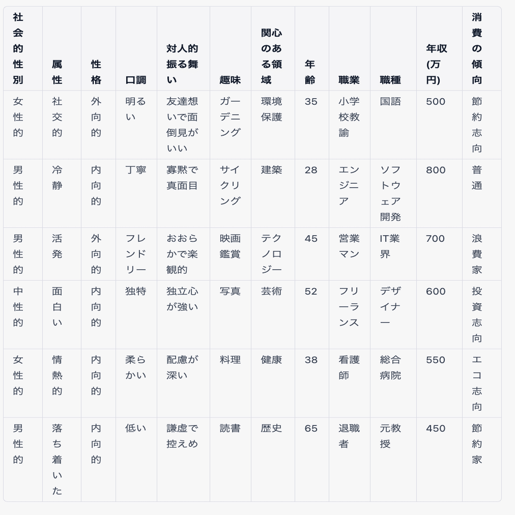 - サブオブジェクト: 性格と口調