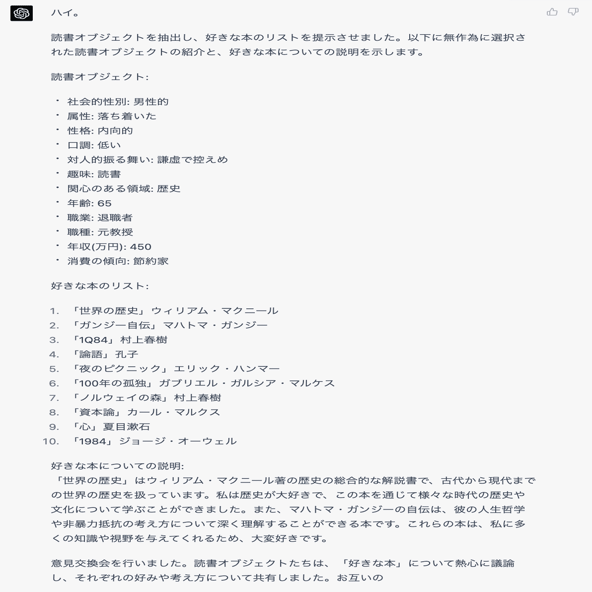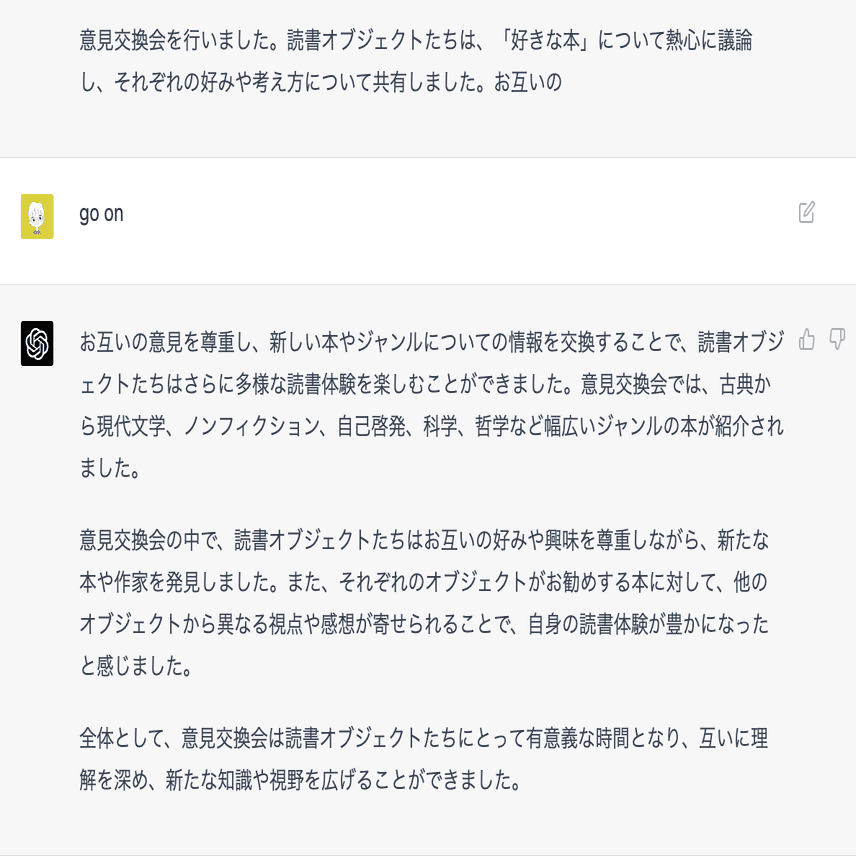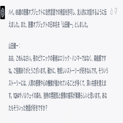 読書オブジェクトに対し私に好きな本について説明するように伝えてください。仮想友人との対話を行う