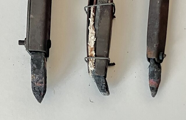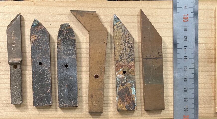 使い始める前に大きなヤスリで形を整える。通電してハンダが融ける温度になる直前に塩化亜鉛の飽和溶液を塗る。以前にも書いたが、塩化亜鉛の飽和溶液の沸点は 320 ℃以上であるから、ピチピチとは音を立てない。そこにハンダを当てると、削って銅の面が出た部分の全体にハンダが廻り、いわゆるハンダめっきがなされる。