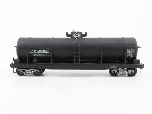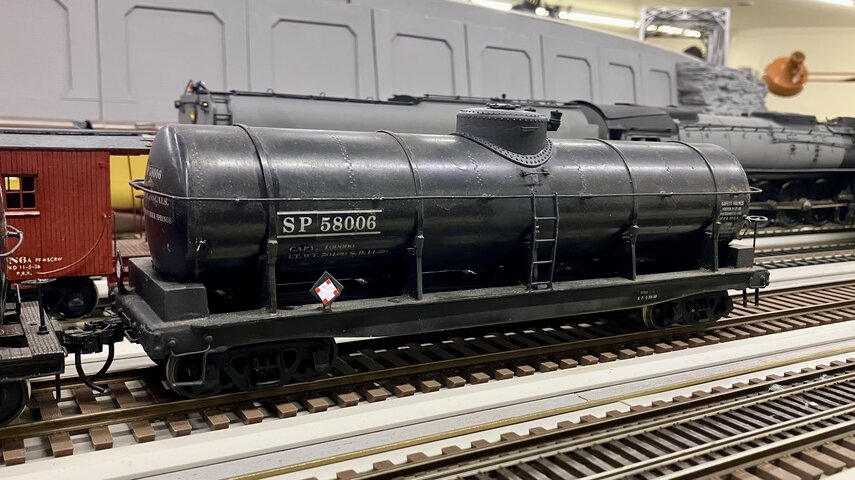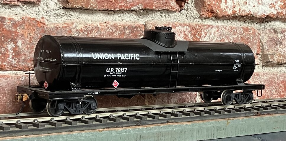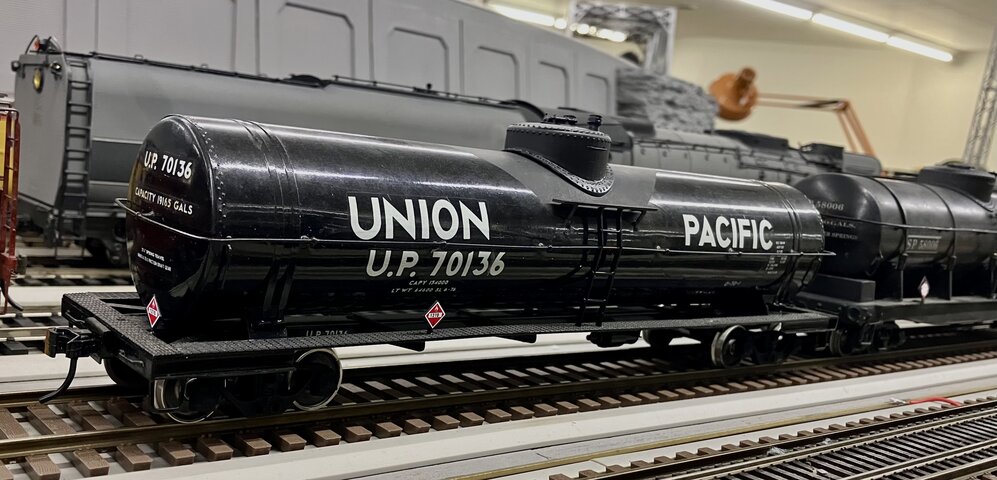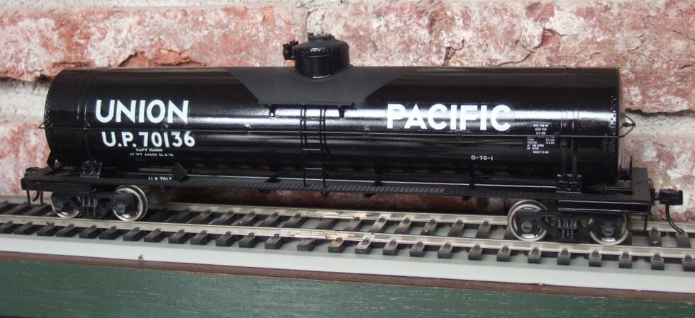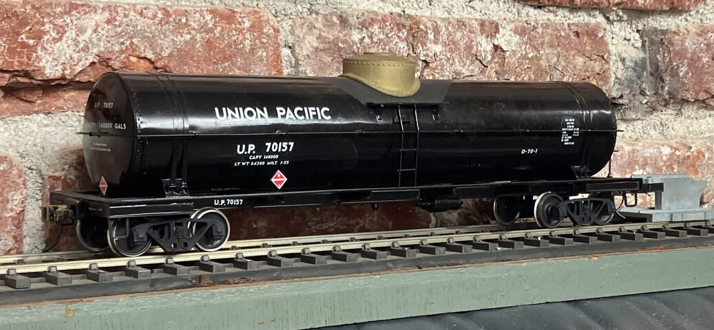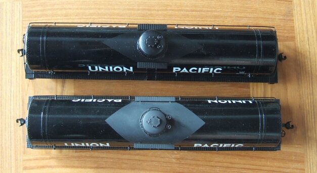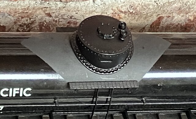 右のタンク車はUPの12500ガロン燃料用タンク車で、筆者の好きな形である。クラブのO氏がドームを作ってくれた。大径で低いドームである。まだ完全には削ってなくて多角形の稜線が見える。軽くヤスリを掛けて艶消し塗装すると全く見えなくなる。