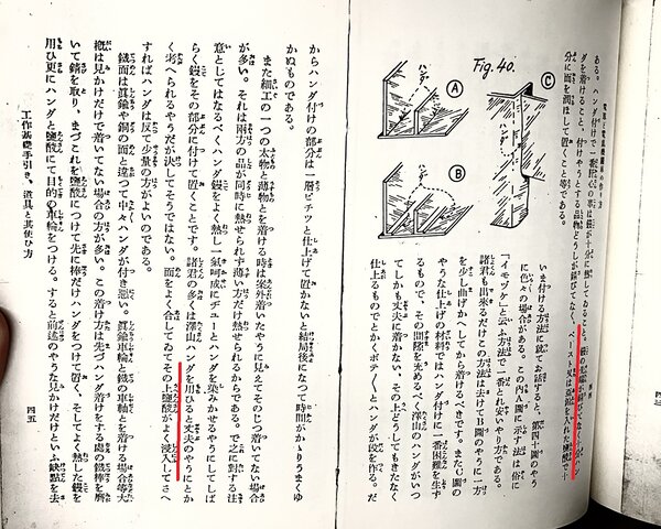 焼けた状態でヤスリを掛ける人が多いが、それは間違いである。瞬時に銅の表面が黒くなるのが分かる。熱くなる前に塩化亜鉛飽和溶液で濡らしておき、ハンダが融ける温度になった瞬間にハンダめっきを掛けるわけである。