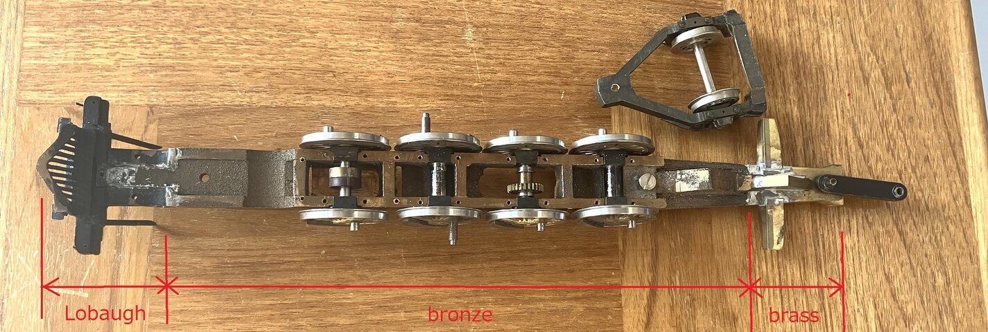 祖父江氏は中に補強を入れれば捻りに耐えるようになるので、実用になるとは言う。預けていた別の台枠が帰って来たものを見たら、なんと厚さ 5 mmの板を切ったものを3枚もはめ込んでハンダ付けしてあった。さらに軸箱護りが実物のように噛み合うようにしてあったのだ。これくらいやれば壊れないよ、ということであったが、もっと単純な解決がしたかった。