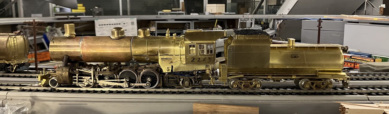 テンダは異常に重い。1.7 kgもある。普通は 500 g程度であるはずだ。床板は鋳物である。タンク部はエンドも一体の構造で、厚肉パイプである。前方の四角の炭庫部分は鋳物を削り出してある。踏んでも壊れないだろう。側面に付いている工具箱はムクの角棒を削ったもので、厚板を組み合わせてテンダ台枠にネジ留めである。