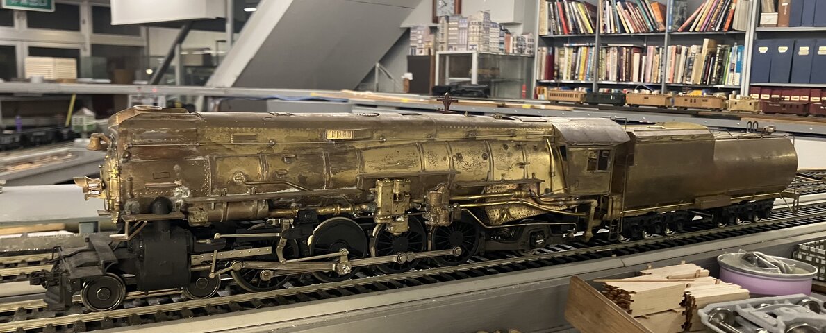 祖父江氏が MT を作り、それを KTM の別の下請け工場でコピィしてUP7000を作った。そのコピィの方をジャンクで手に入れた。テンダが無かったのでスクラッチから作った。UPの9000 (4-12-2) のテンダと同形のものを設計した。材料が厚過ぎて重くなったが、ボールベアリングを付けてよく走るようにした。それを別の機関車に流用したので、この写真のテンダはSP5000用を仮に置いてある。