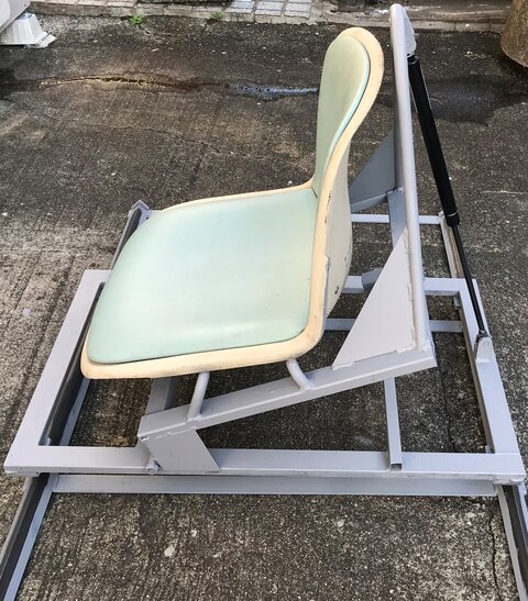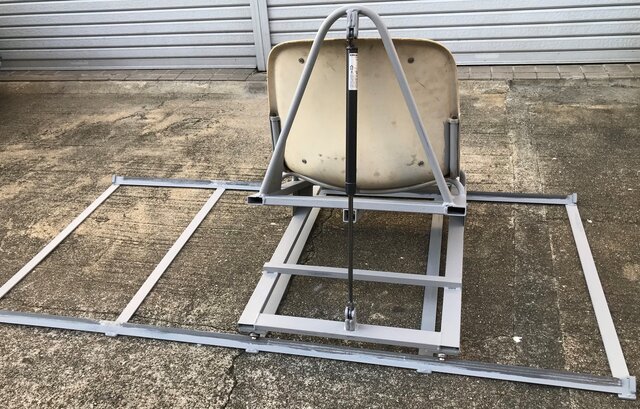 友人の鉄工所に図面を持って行って相談すると、「それは面白い」とすぐに作ってくれた。自動車のリア・ハッチを支えるガス・スプリングを付けると、体重を掛ければ静かに沈み、立ち上がるときはかなり早く追随するので、立ち上がりやすい。沈む速度よりも復帰する速度の方がはるかに大きいので、少し体を持ち上げて体勢を立て直すときには沈まない。だから楽に立ち上がれる。もちろん頭上にあるハンドル(グラブアイアン)を掴んで体を持ち上げるのだ。何回かやってみると、なかなか具合が良い。