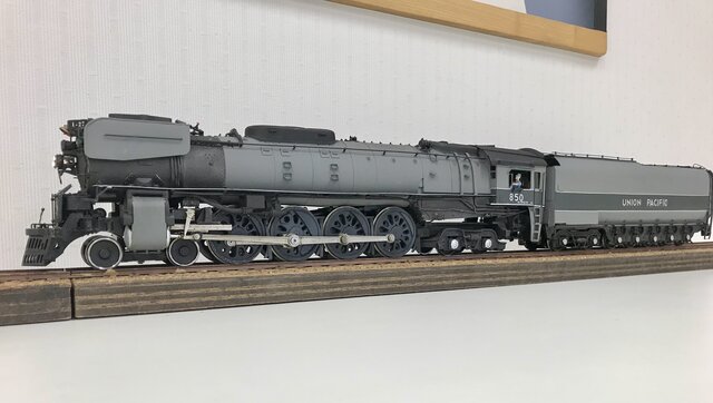 テイブルが余っているので、筆者も直線の線路を敷き、運転をした。例の慣性増大装置付きのUP850 4-8-4だ。この写真を見て気が付いたが、先台車の外れ止め鎖を付けていくのを忘れていた。あまりにも透けていて良くない。